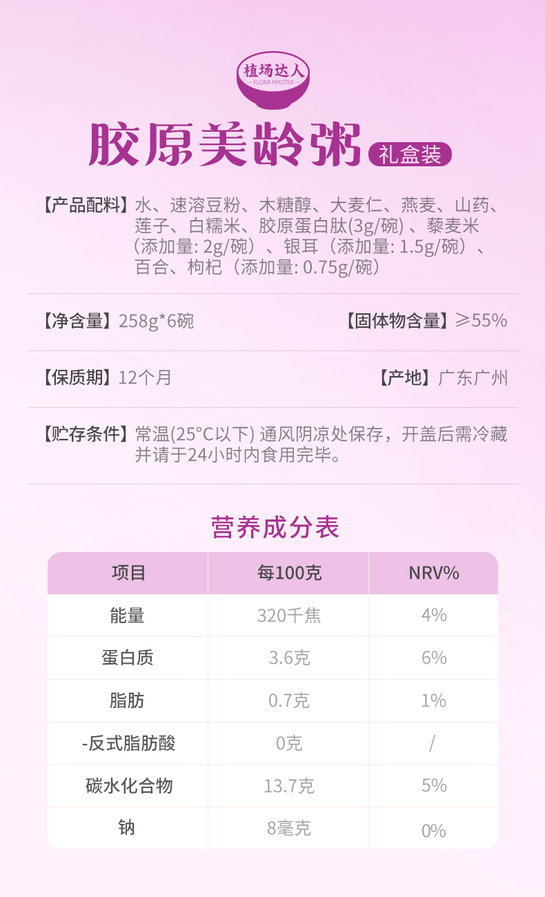 商品名称:植场达人胶原美龄粥礼盒装258g*6碗