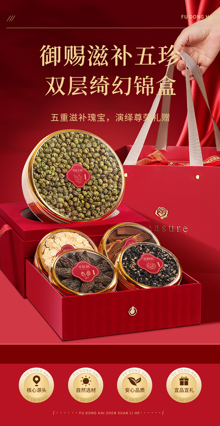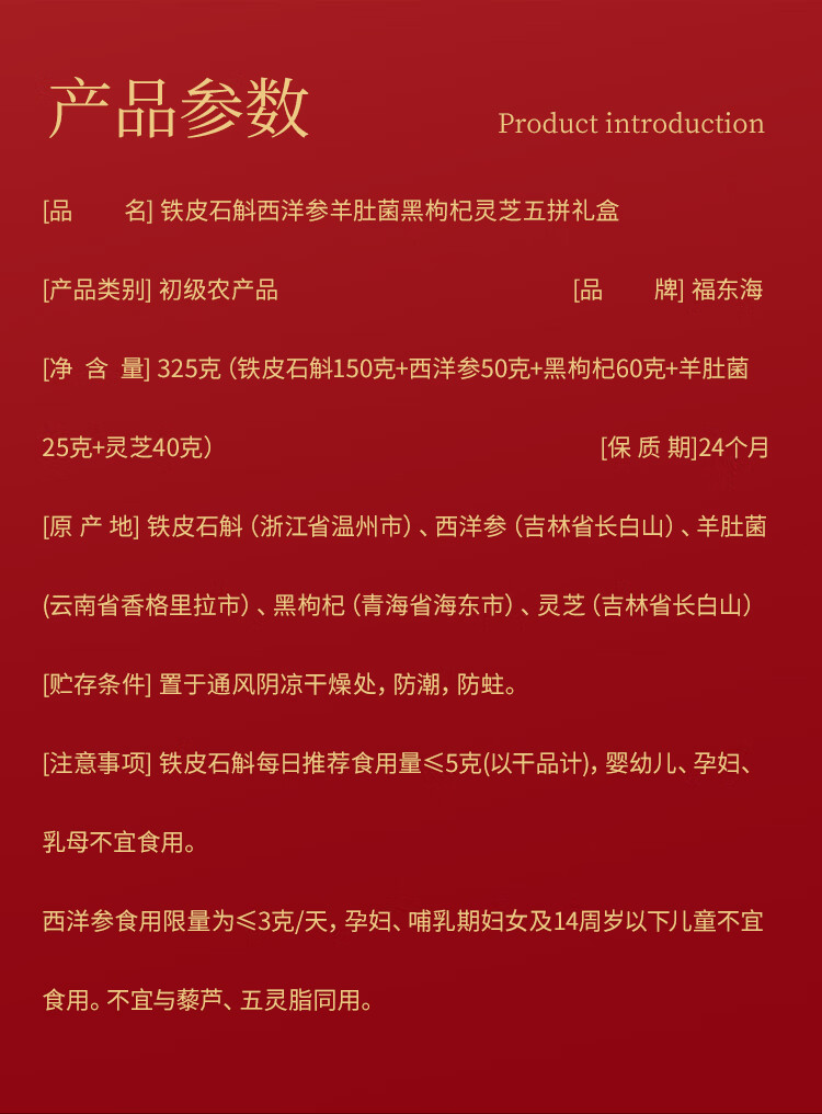 商品名称:福东海铁皮石斛西洋参羊肚菌黑枸杞灵芝五拼礼盒325g