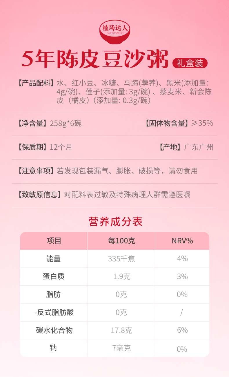 商品名称:植场达人5年陈皮豆沙粥礼盒装258g*6碗