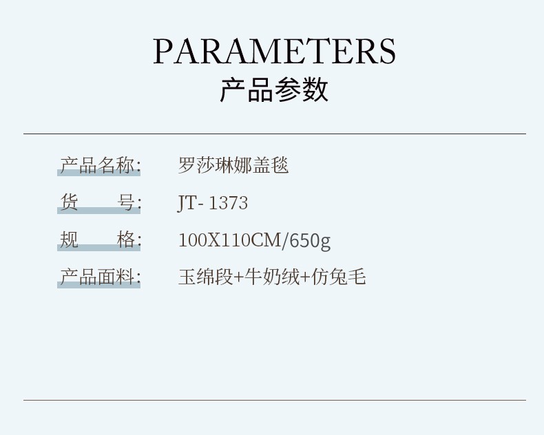 商品名称:KINTHERI/金丝莉罗莎琳娜盖毯100*110cm 650g