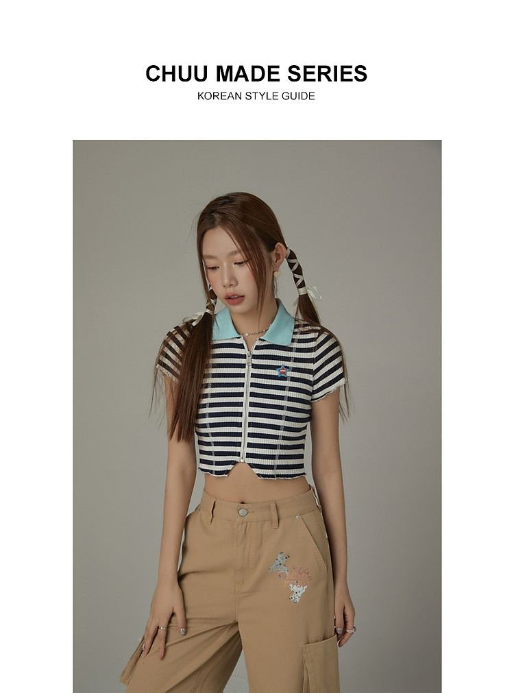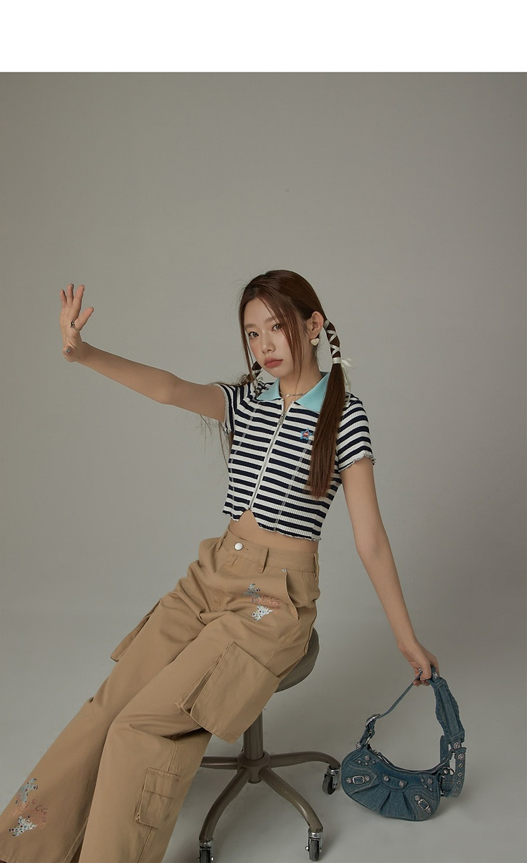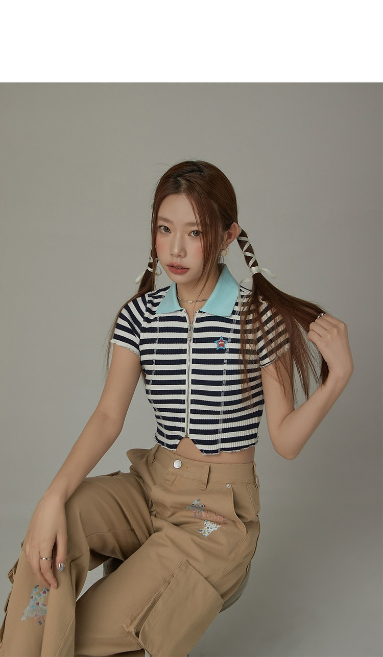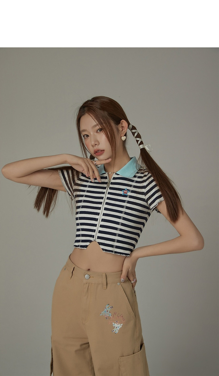条纹拉链T恤女春夏修身显瘦减龄洋气星星短款上衣 271187
