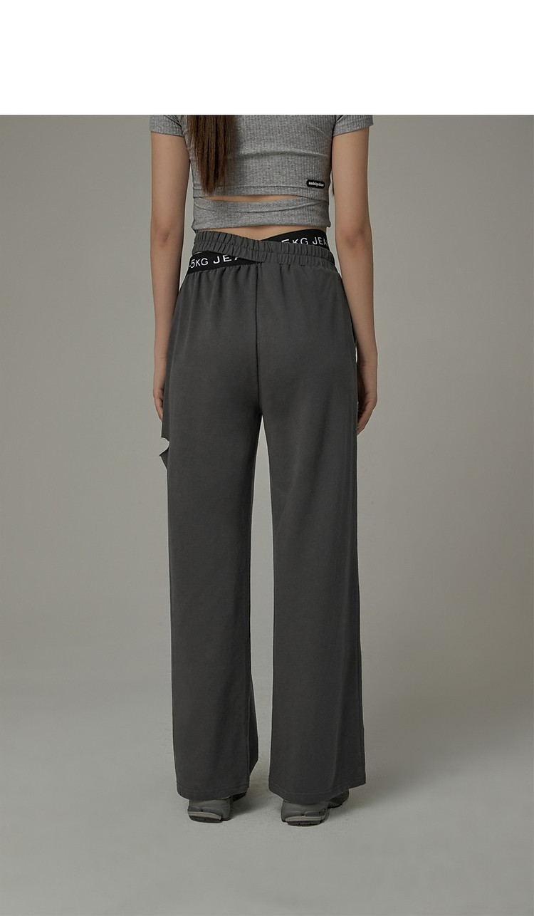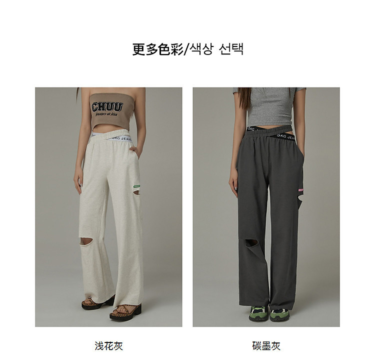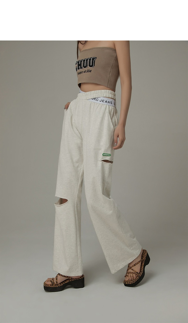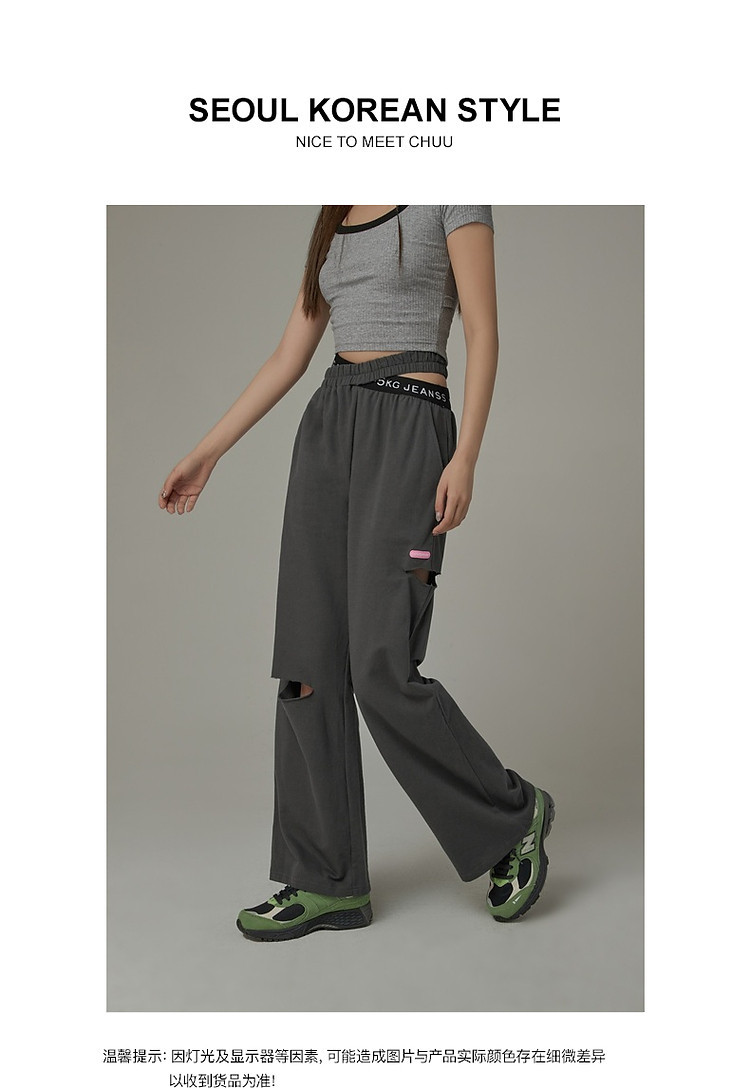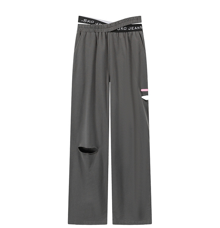 商品名称:破洞阔腿休闲裤女士2025春夏辣妹交叉腰拼接运动长裤子 343059