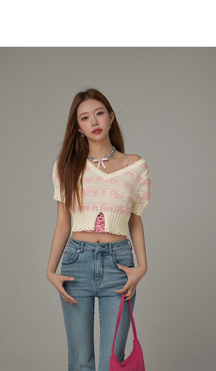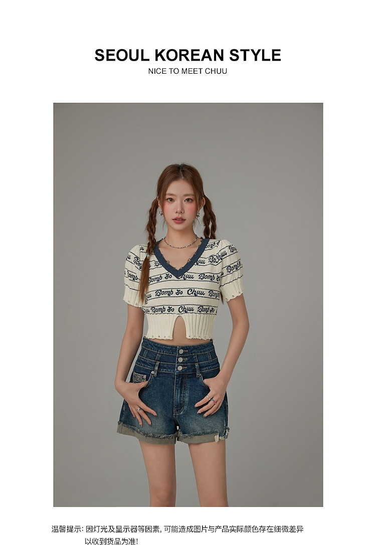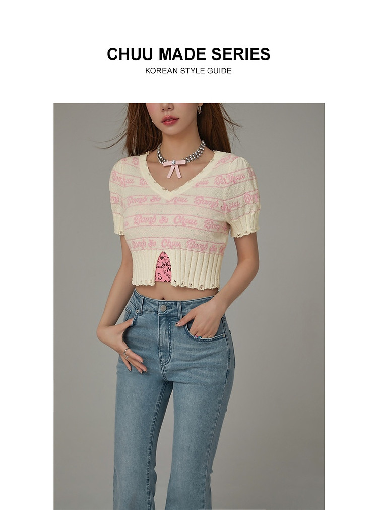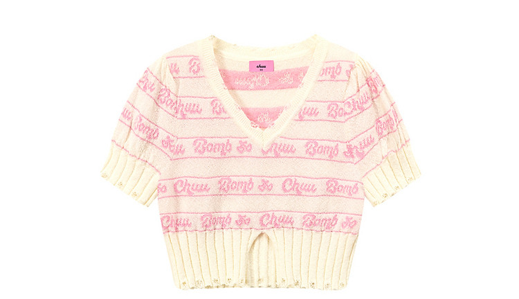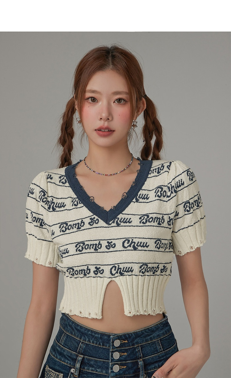 商品名称:字母提花撞色2025夏磨破开叉短袖针织衫 021907