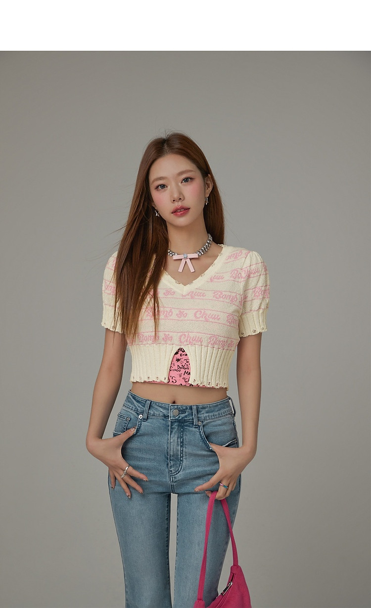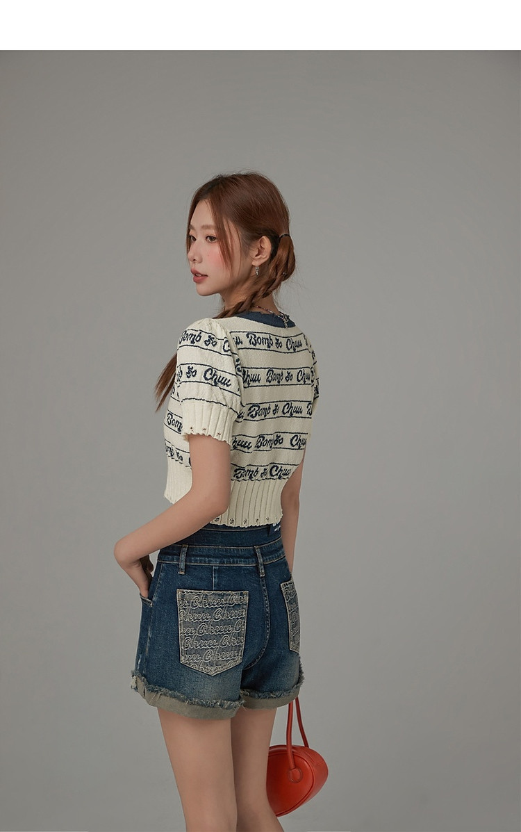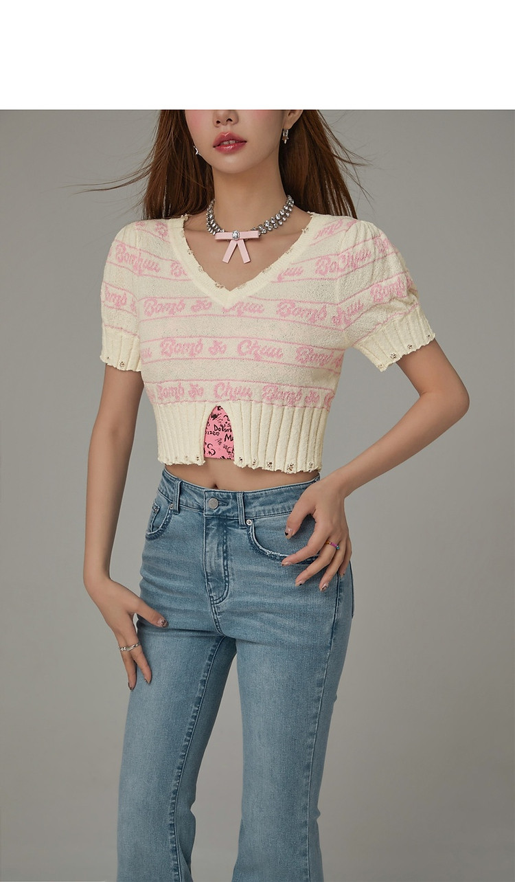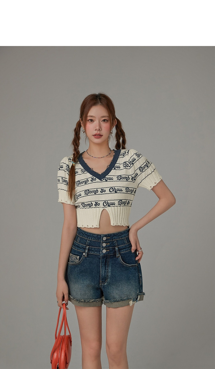 字母提花撞色2025夏磨破开叉短袖针织衫 021907