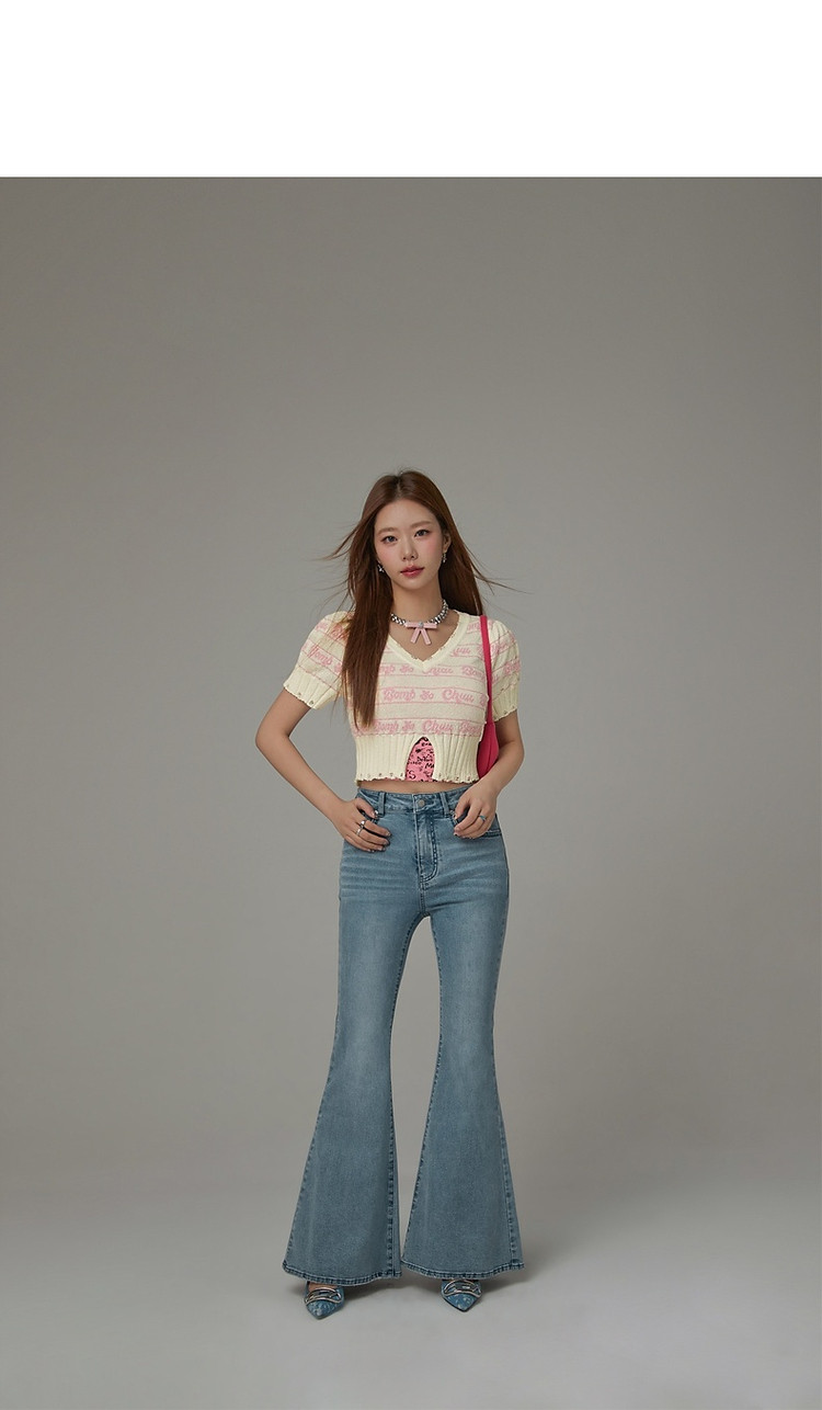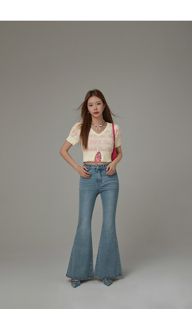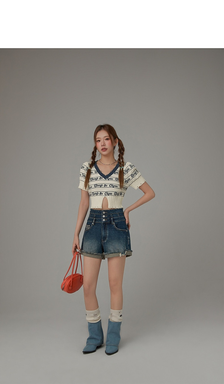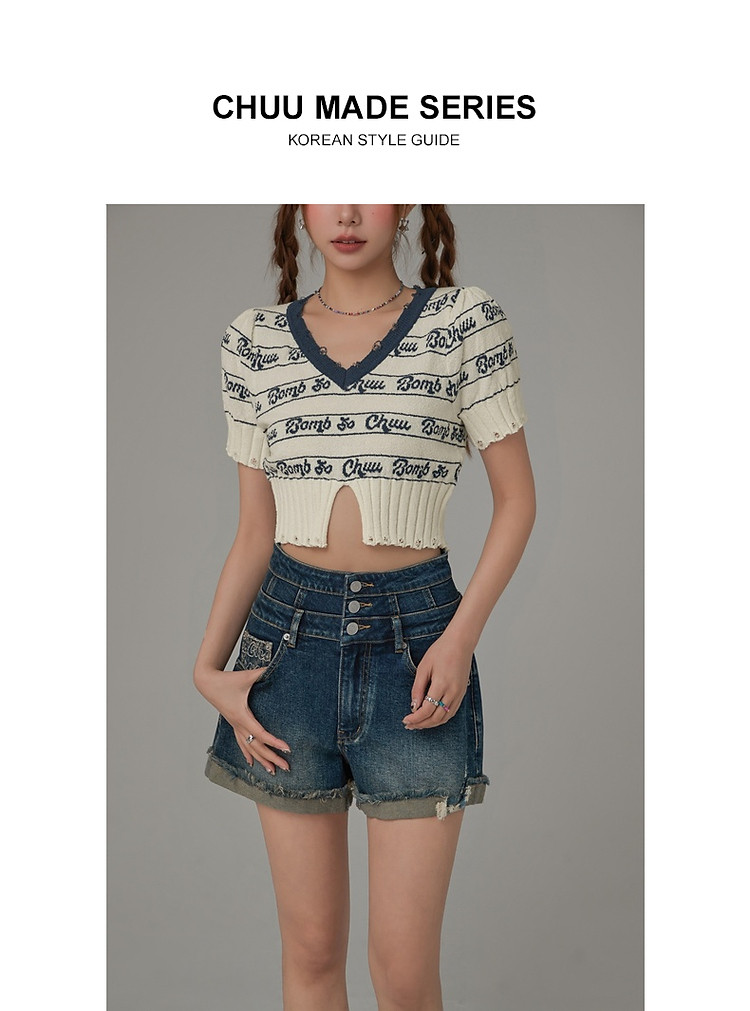 字母提花撞色2025夏磨破开叉短袖针织衫 021907
