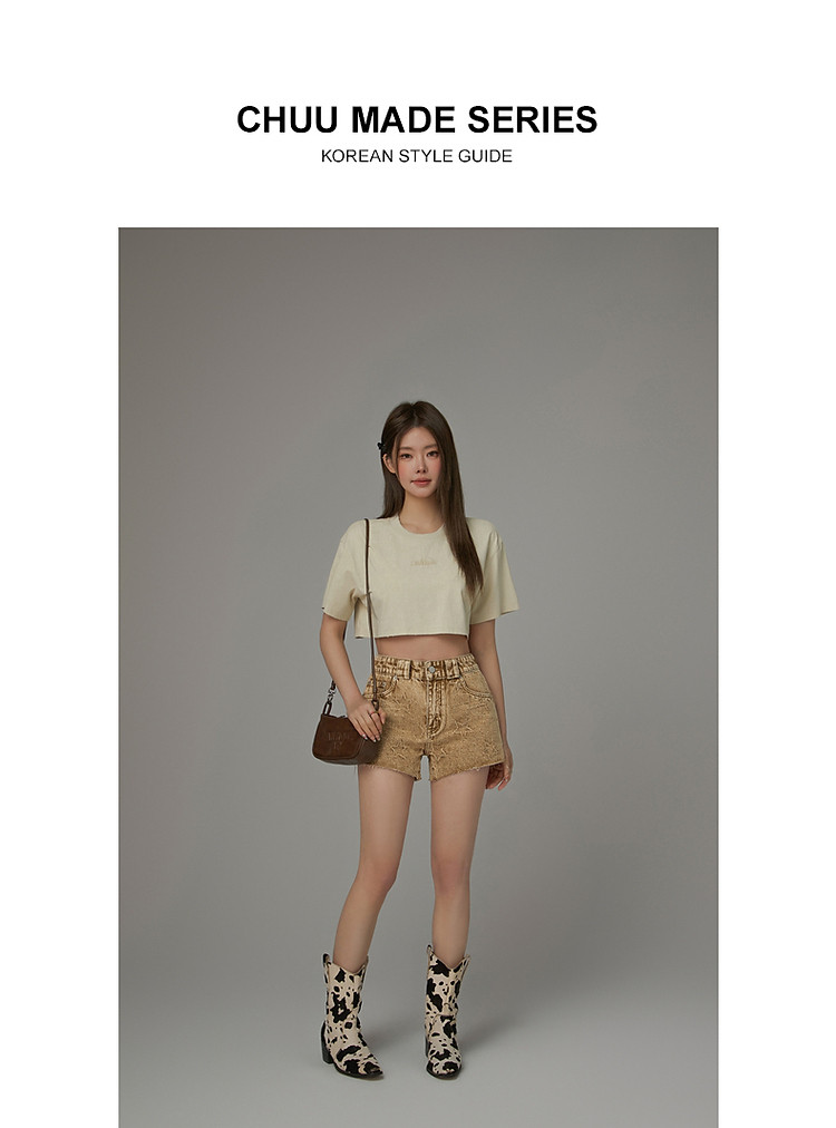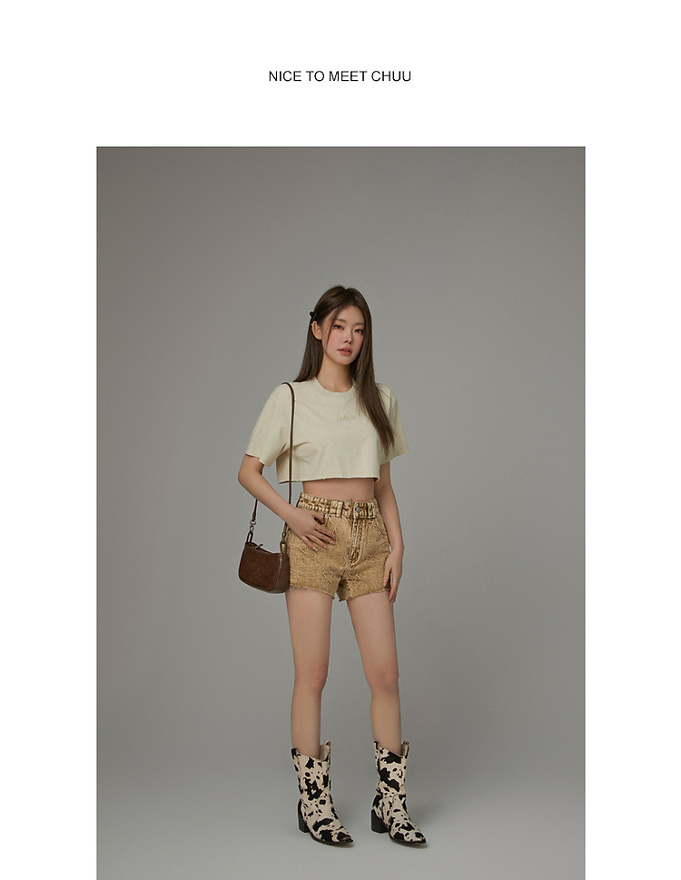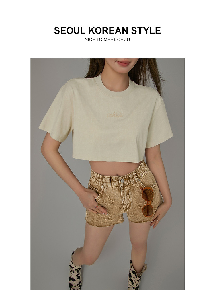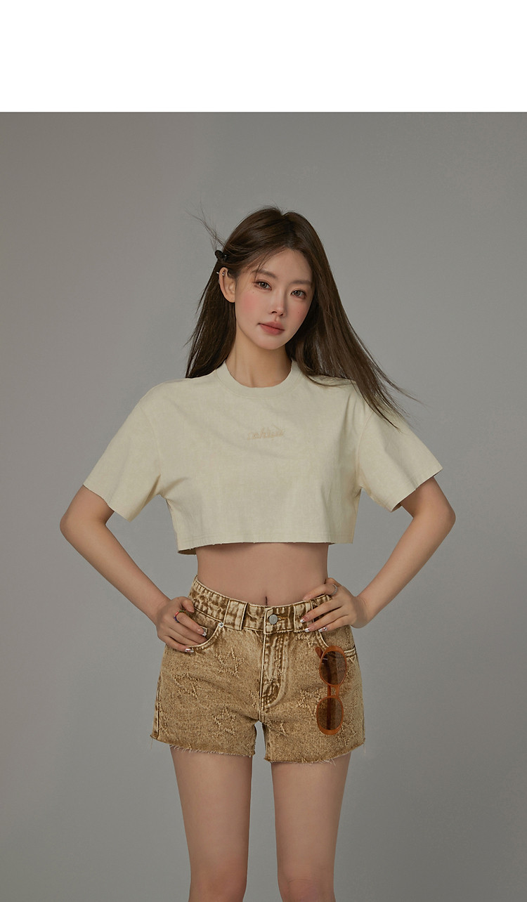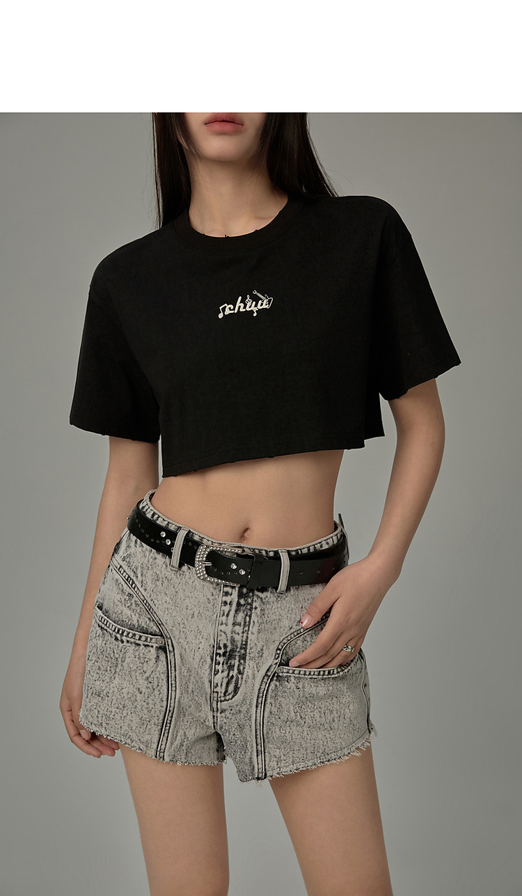 字母音符刺绣T恤女2025夏辣妹磨破短袖宽松短上衣 384531