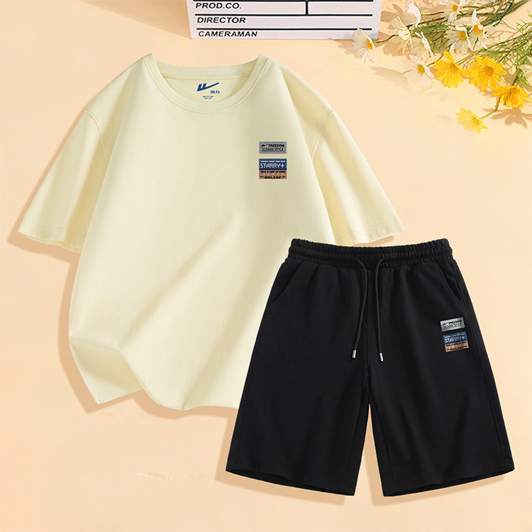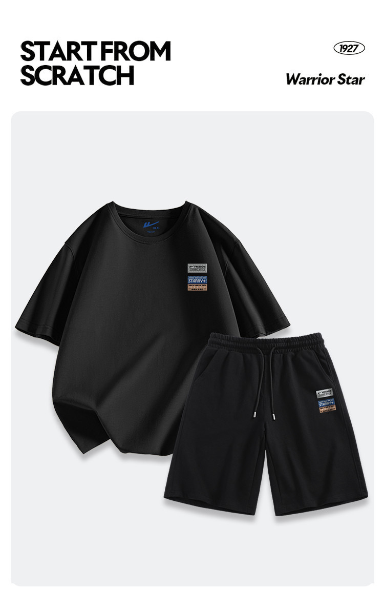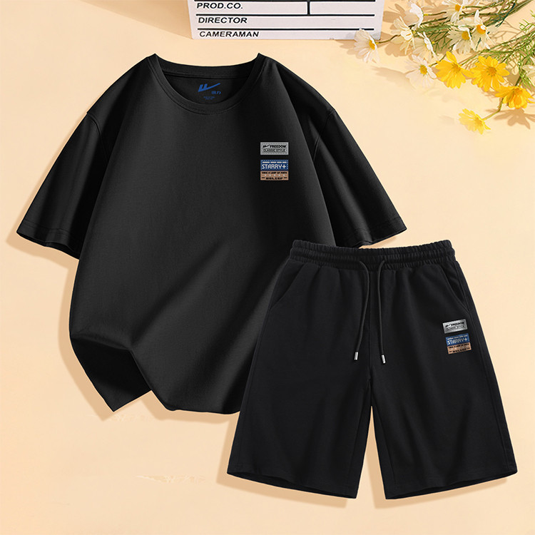 【100%棉】夏季重磅纯棉跑步篮球健身休闲短袖短裤运动套装男 081363