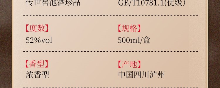 商品名称:泸州老窖 传世窖池酒珍品 52度浓香型白酒 500ml*6瓶