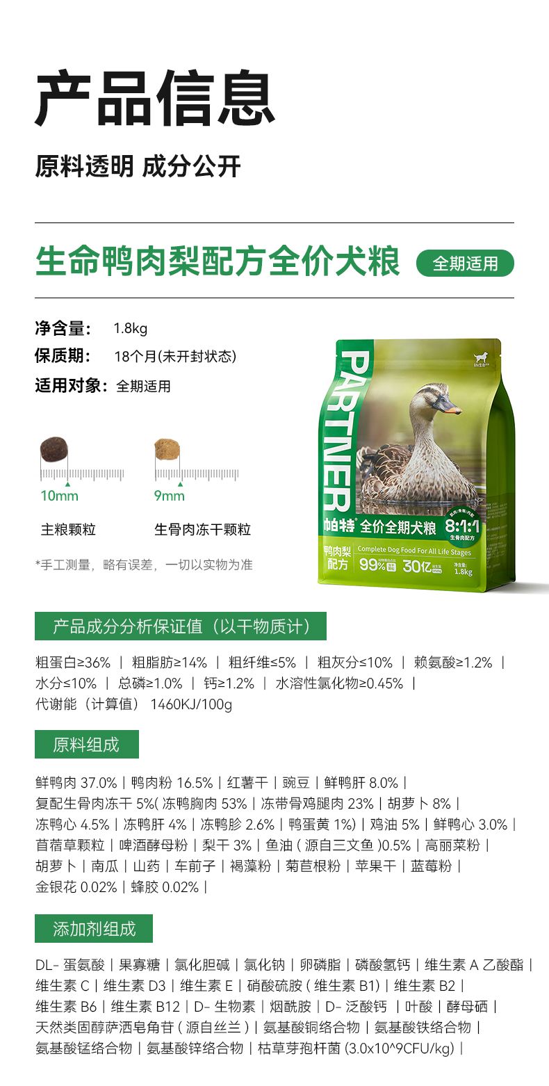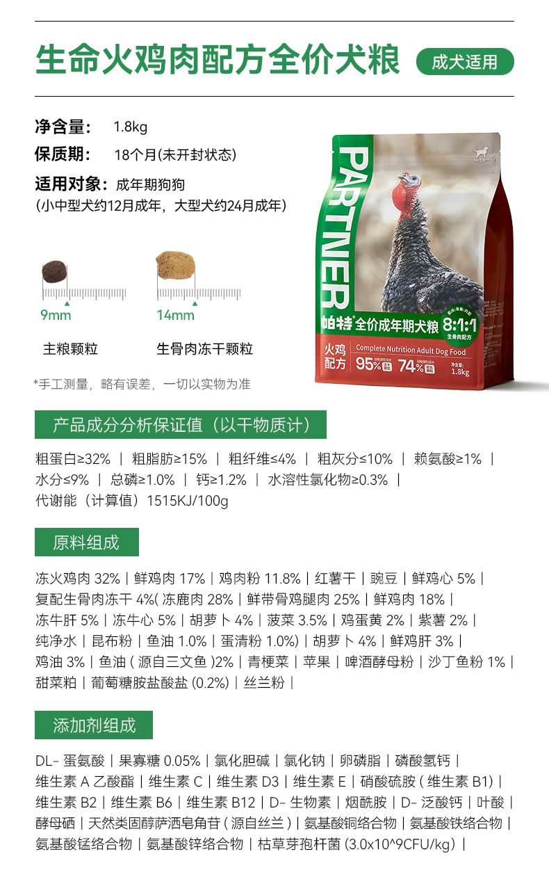 商品名称:帕特 全价成年期犬粮-火鸡肉配方、生骨肉混合