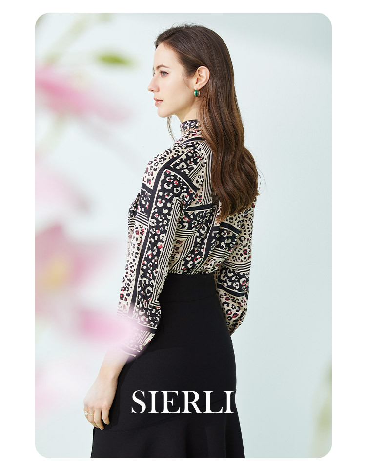 商场同款春季复古豹纹印花雅致气质款立领长袖衬衣 687071