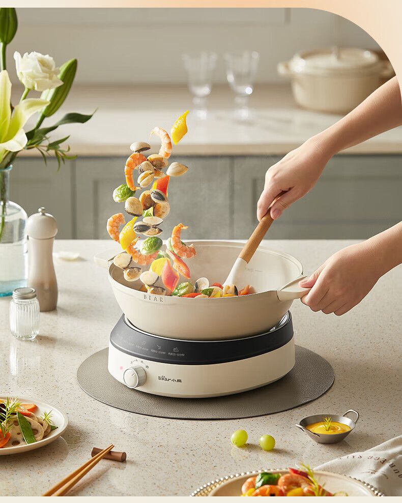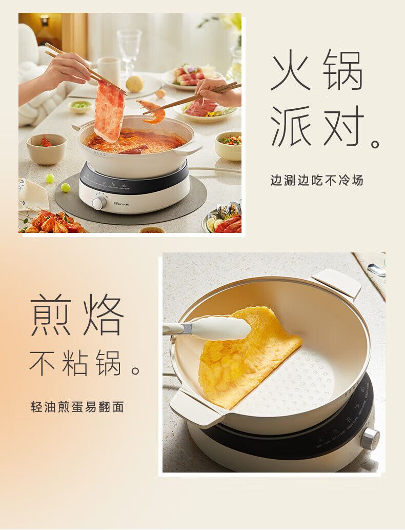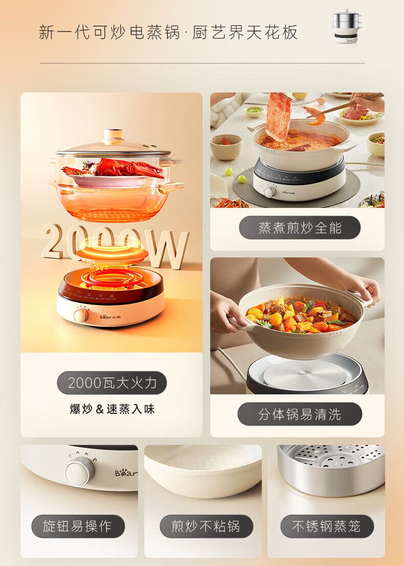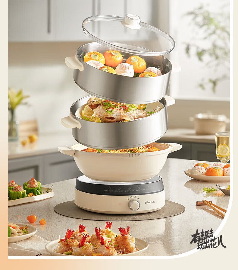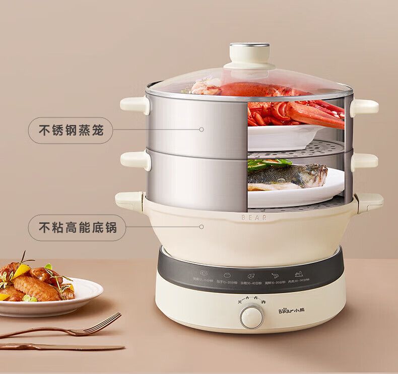小熊电蒸锅DZG-CA3G1 多用途锅 家用三层大容量分体可拆洗电火锅电炒锅多功能锅(煮锅4L+蒸锅5L*2)