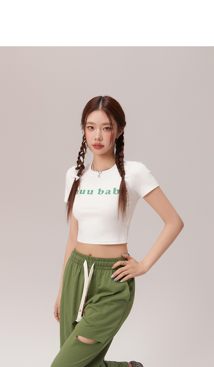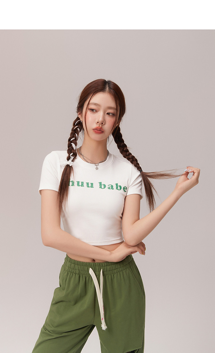 字母印花正肩T恤女2025夏辣妹修身基础学院短袖上衣 507347