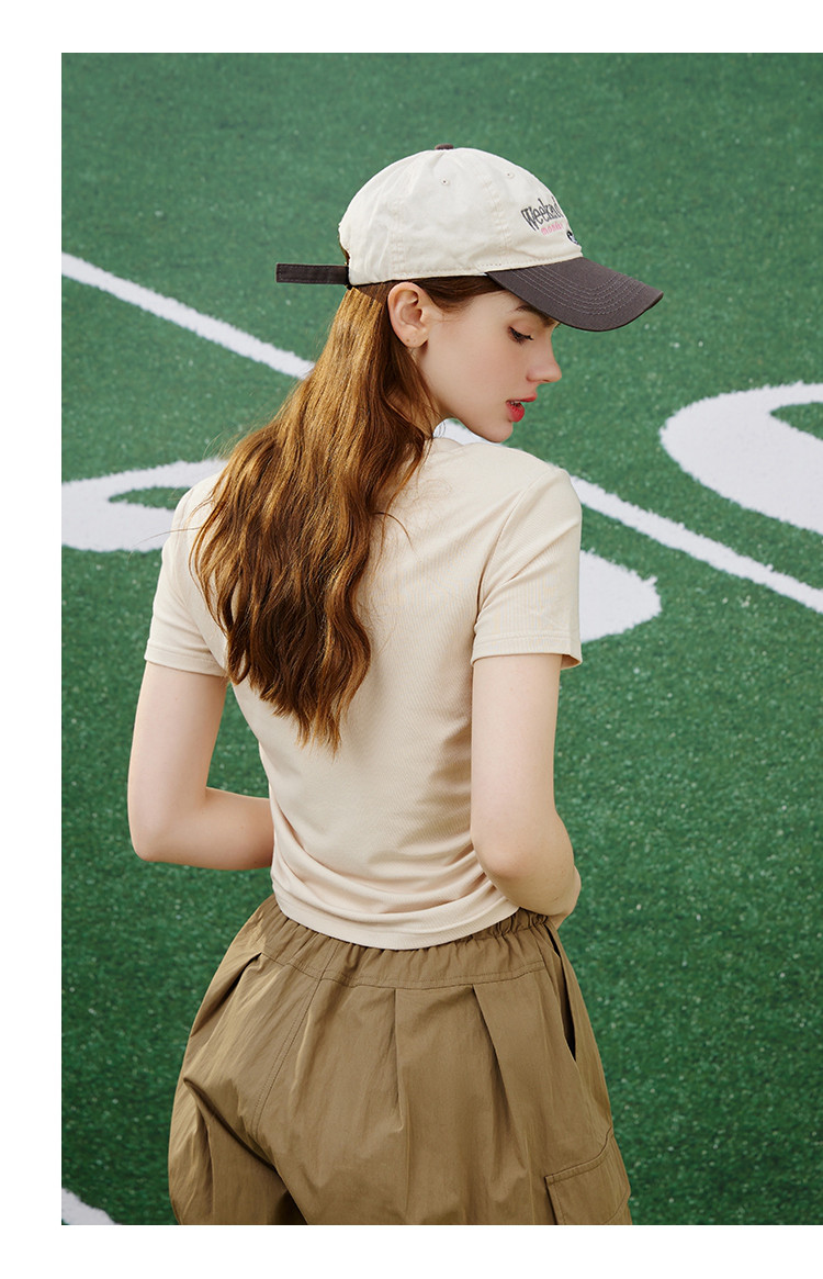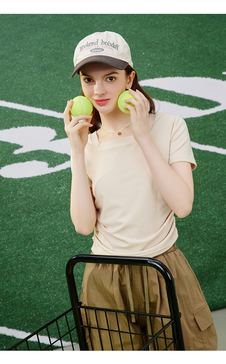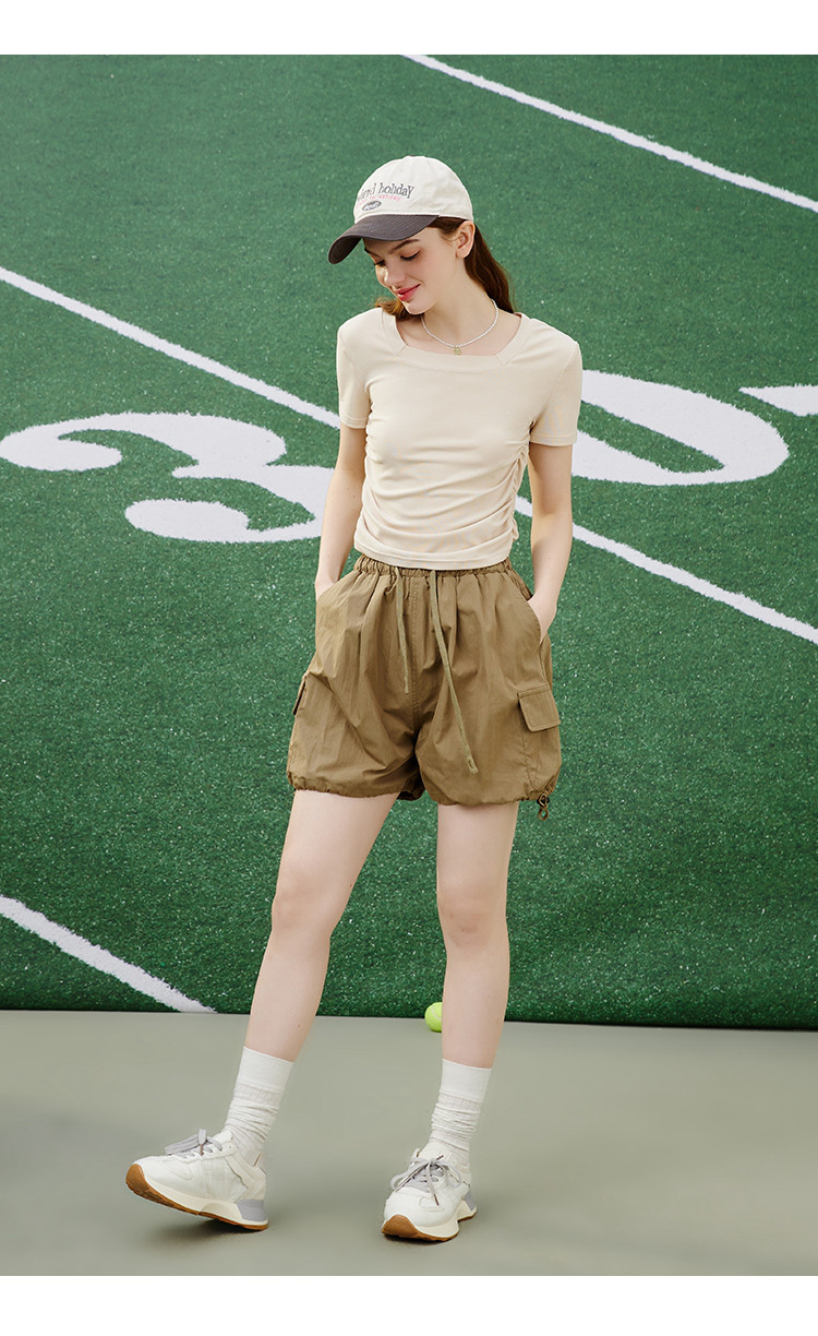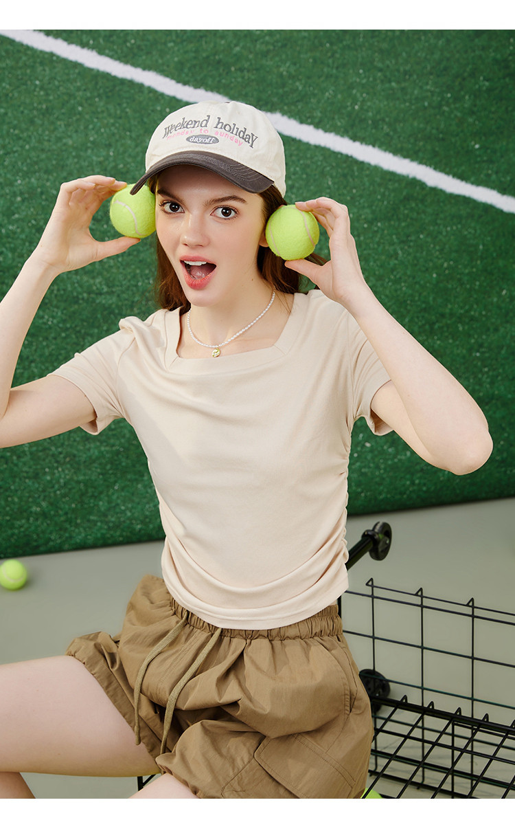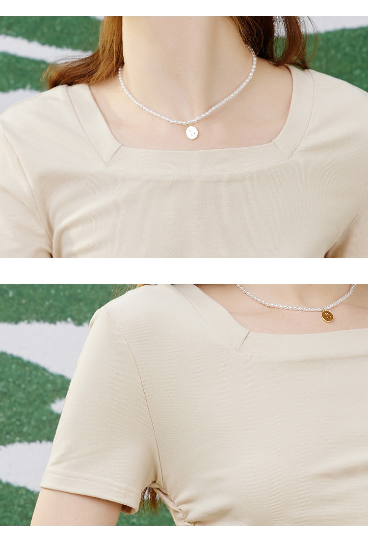 商品名称:纯色简约方领抽褶设计短袖上衣夏季休闲修身女式T恤 032861