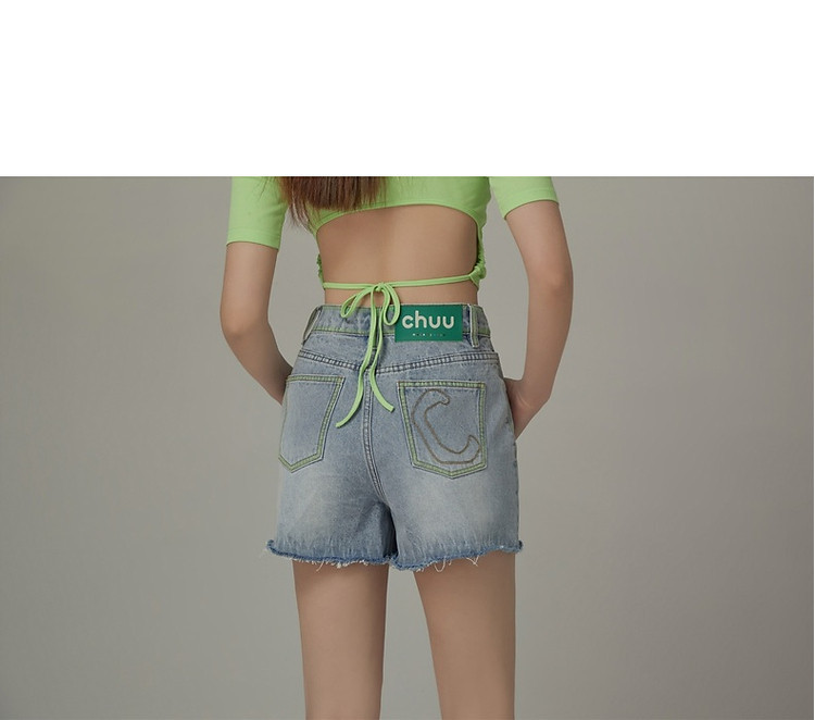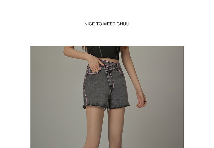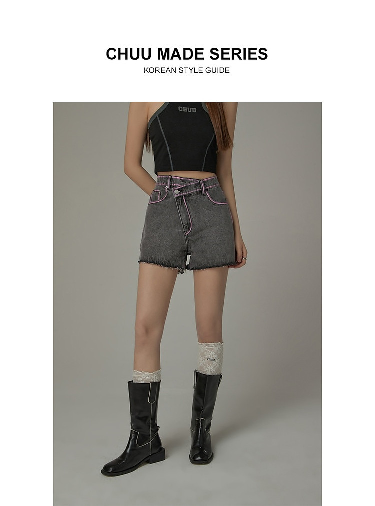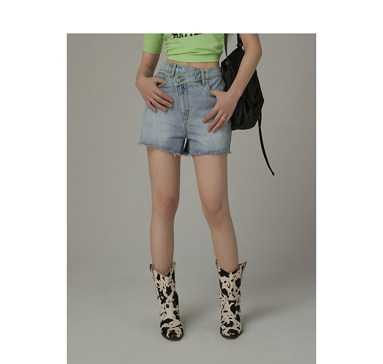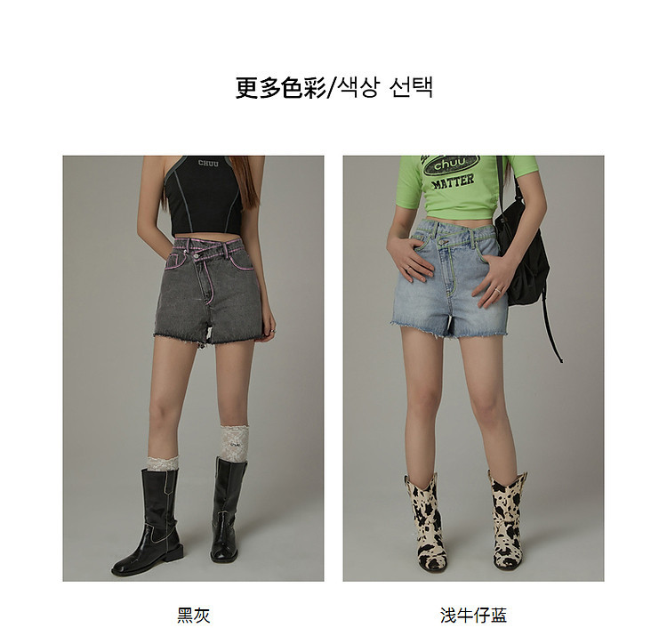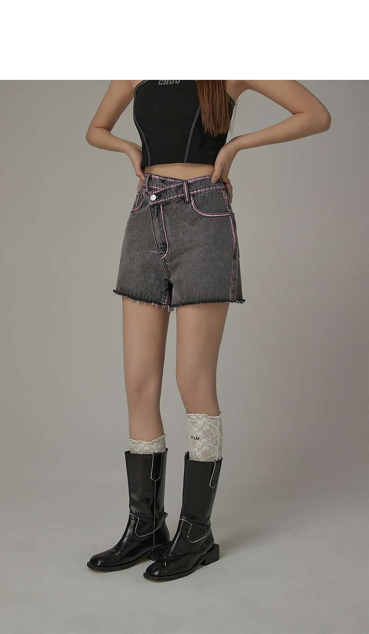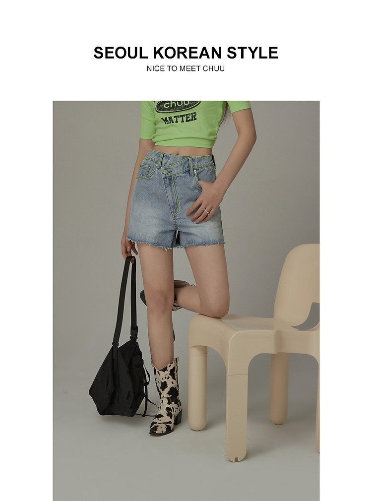 商品名称:斜门襟撞色毛边牛仔短裤女2025夏辣妹热裤直筒裤 337619
