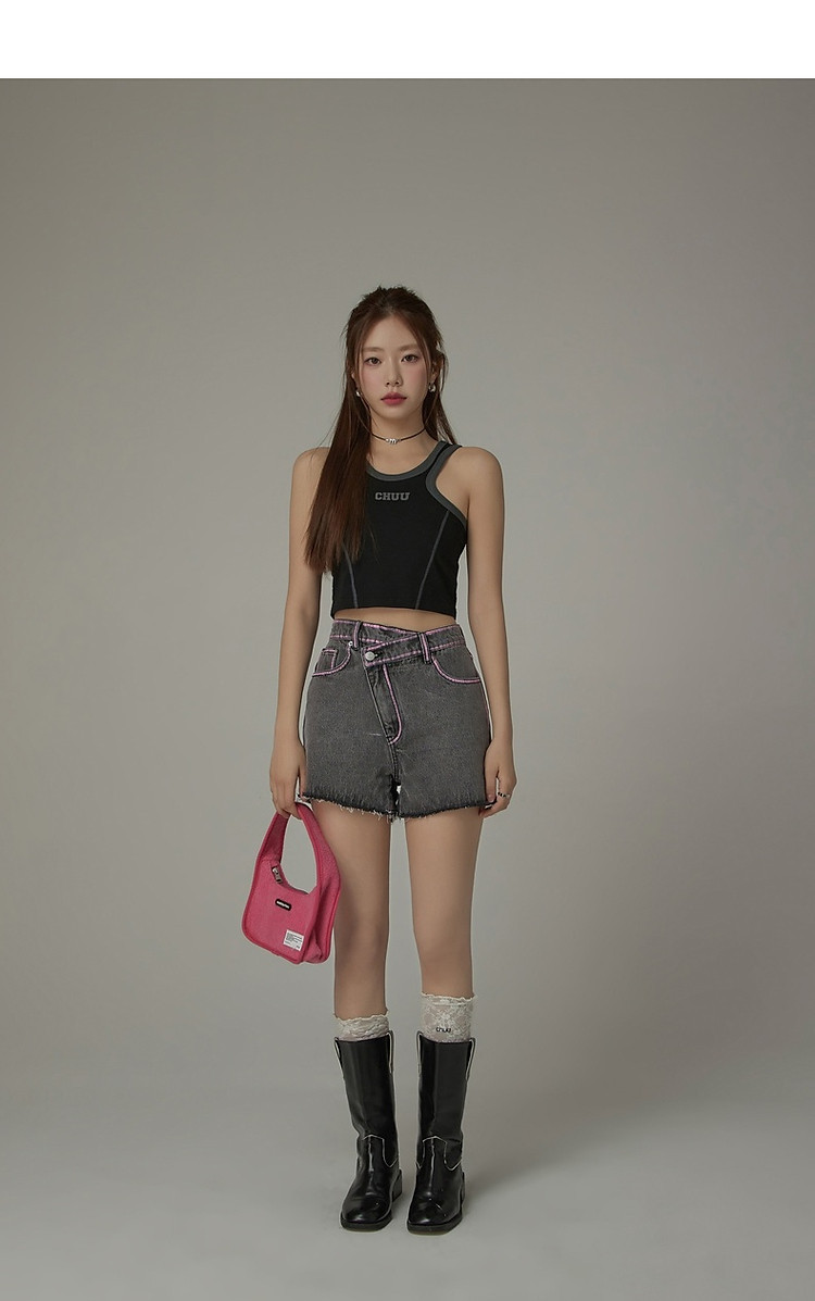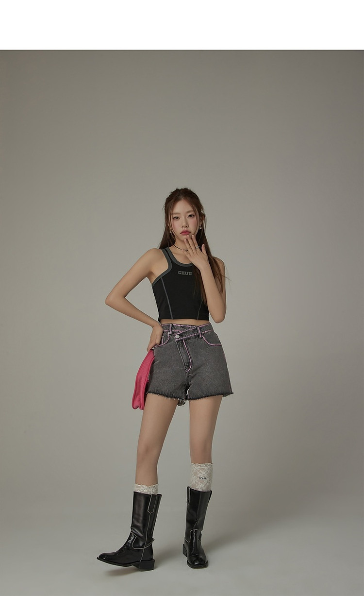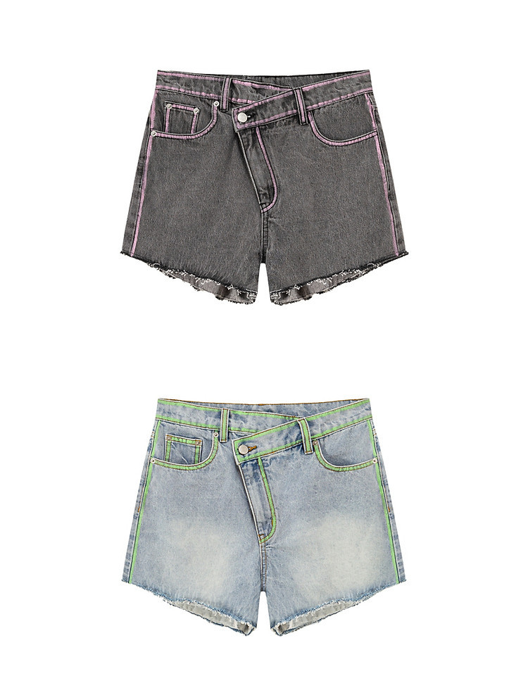 斜门襟撞色毛边牛仔短裤女2025夏辣妹热裤直筒裤 337619