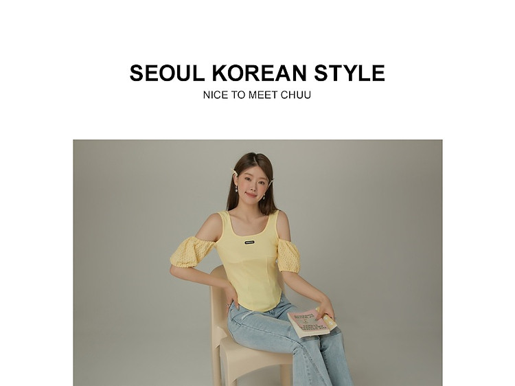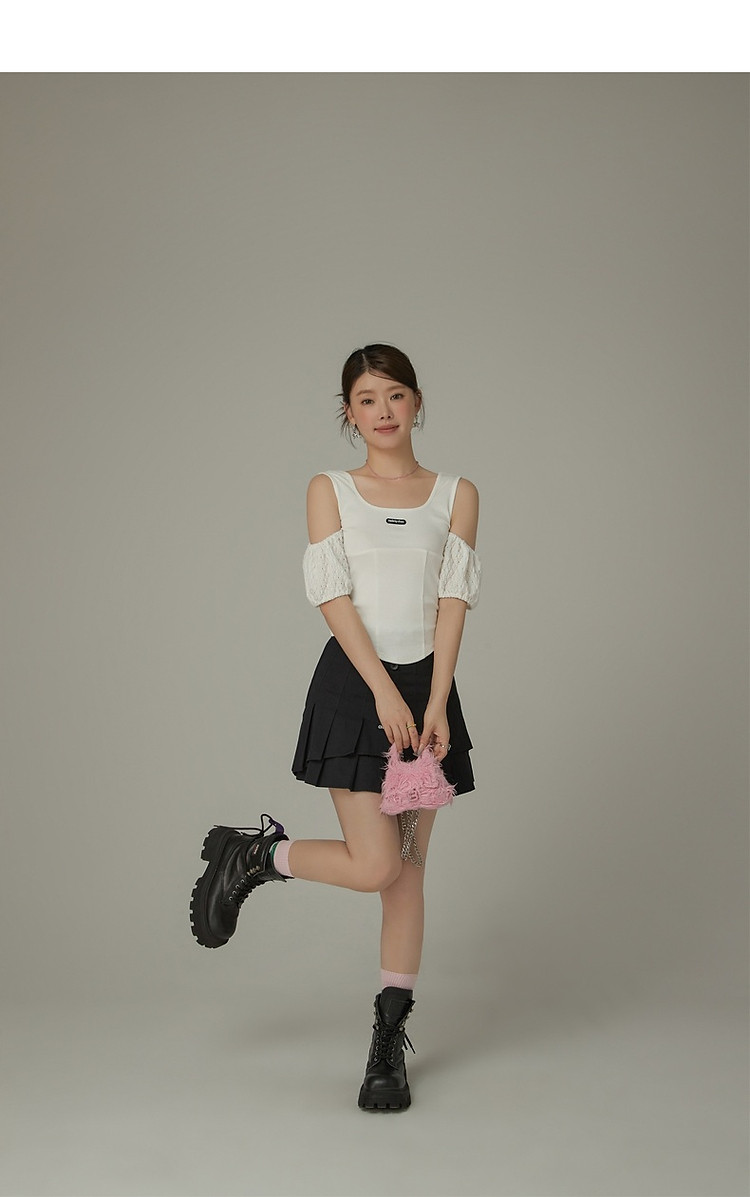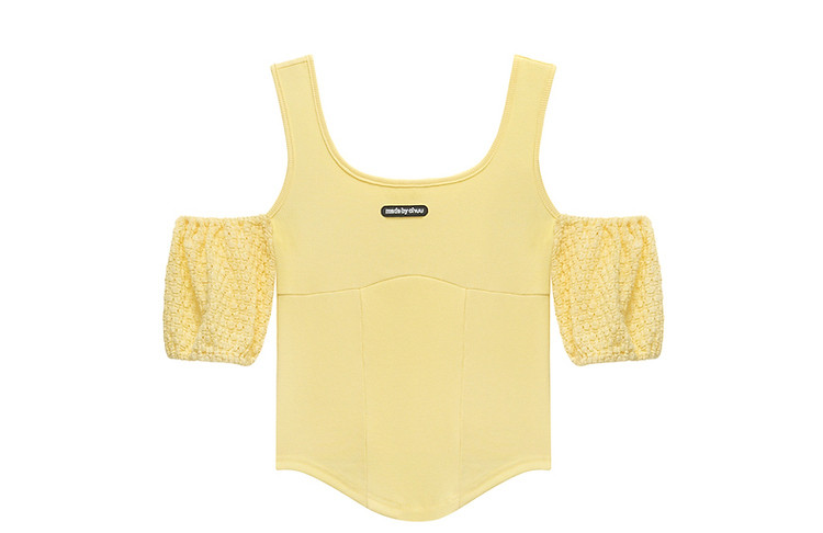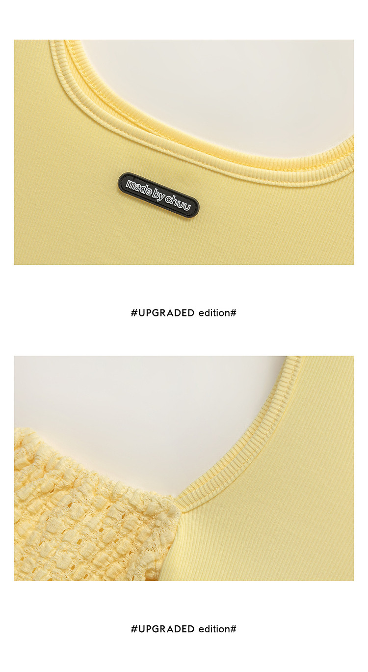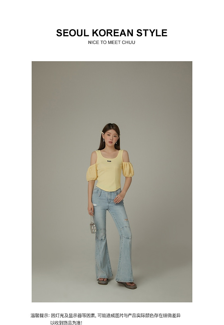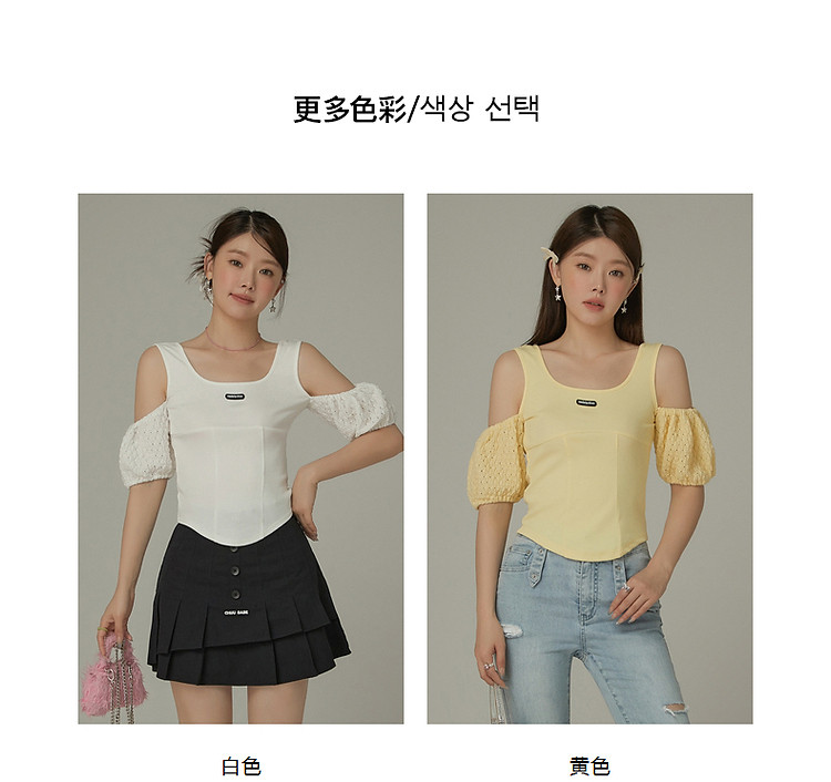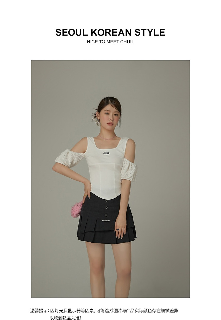 商品名称:CHUU露肩雪纺衫女夏褶皱镂空拼接泡泡袖短款上衣 789907
