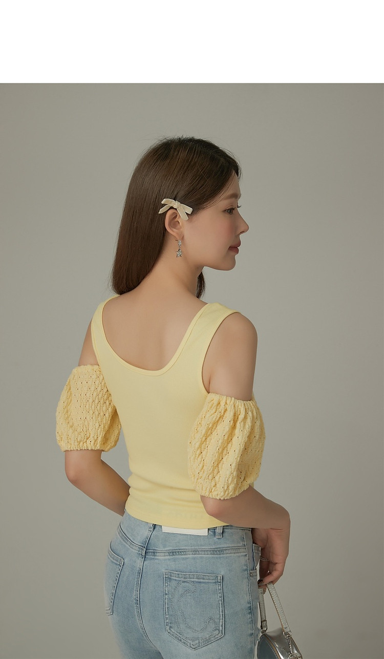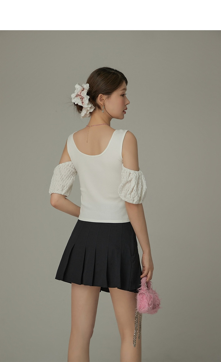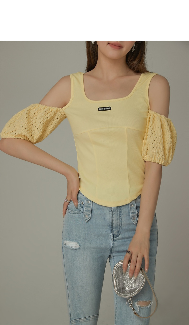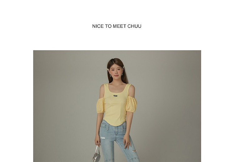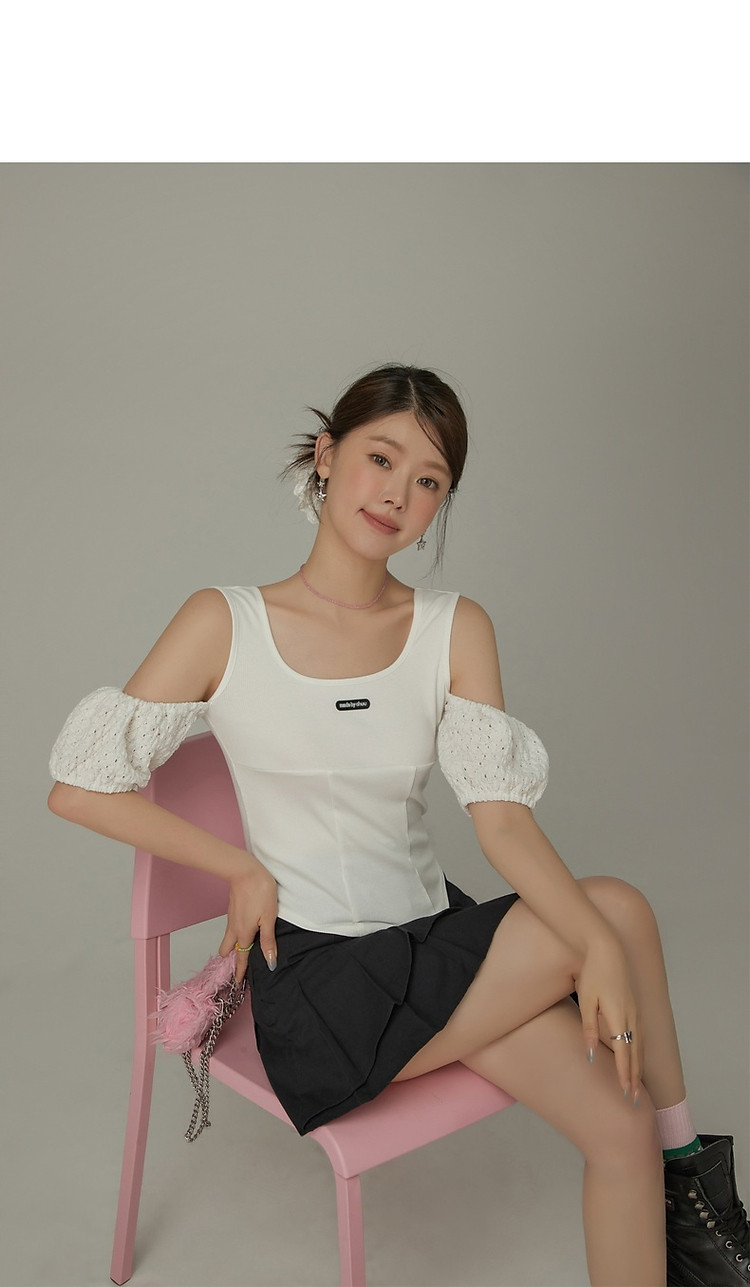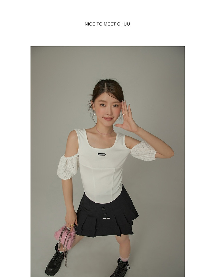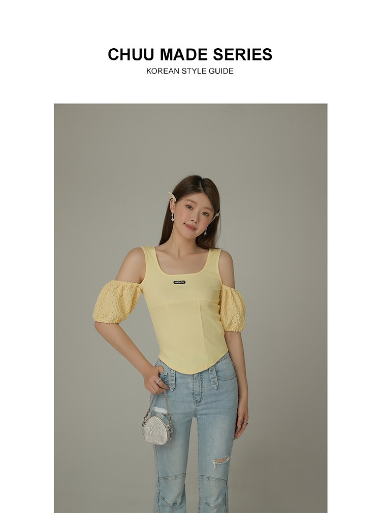 CHUU露肩雪纺衫女夏褶皱镂空拼接泡泡袖短款上衣 789907