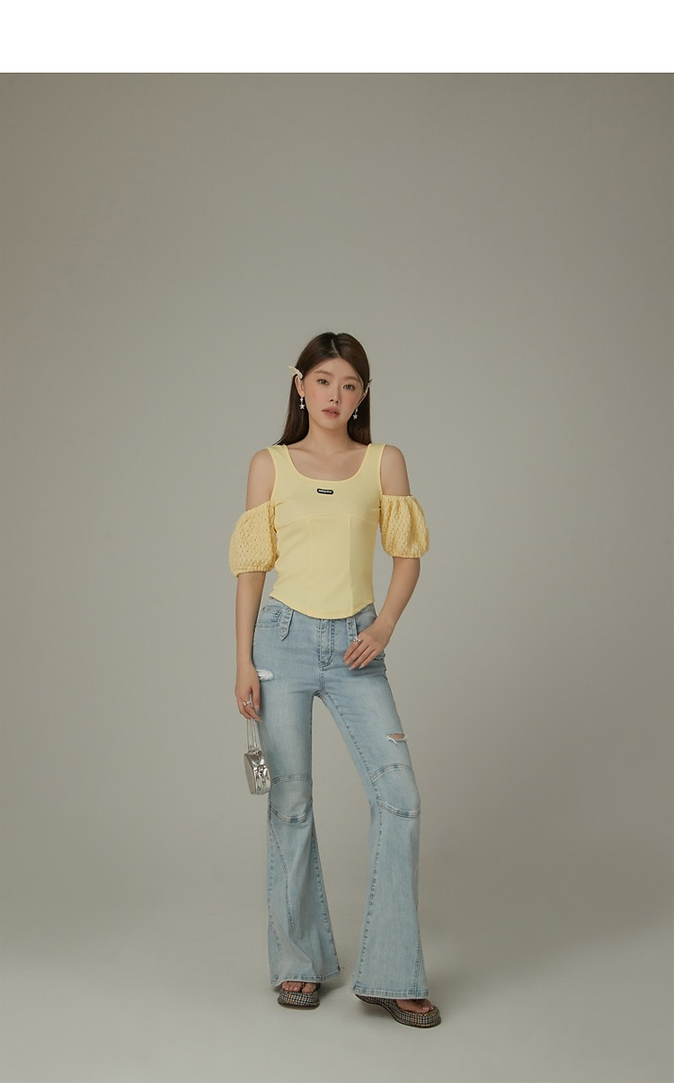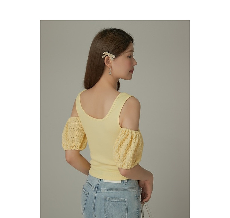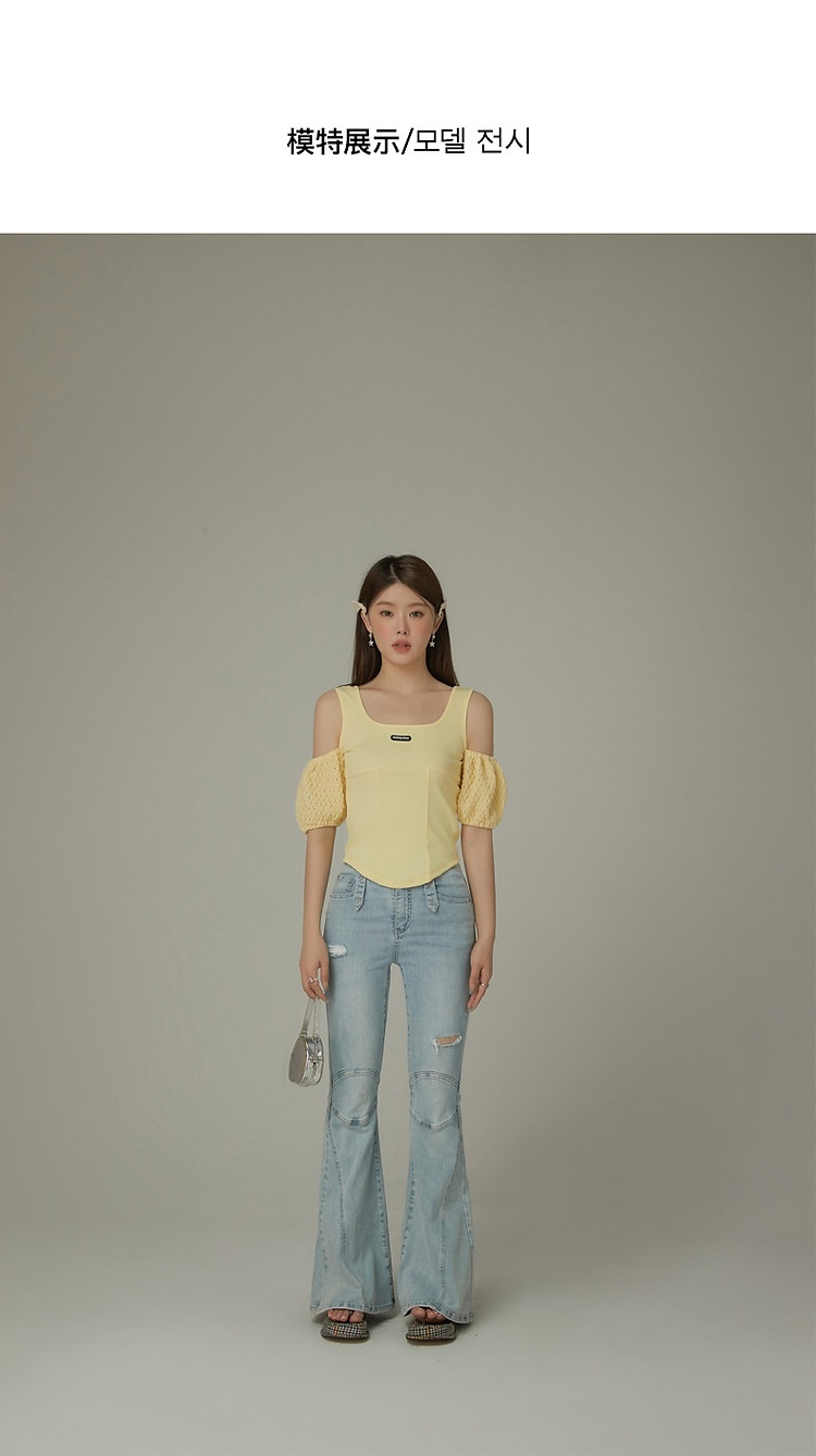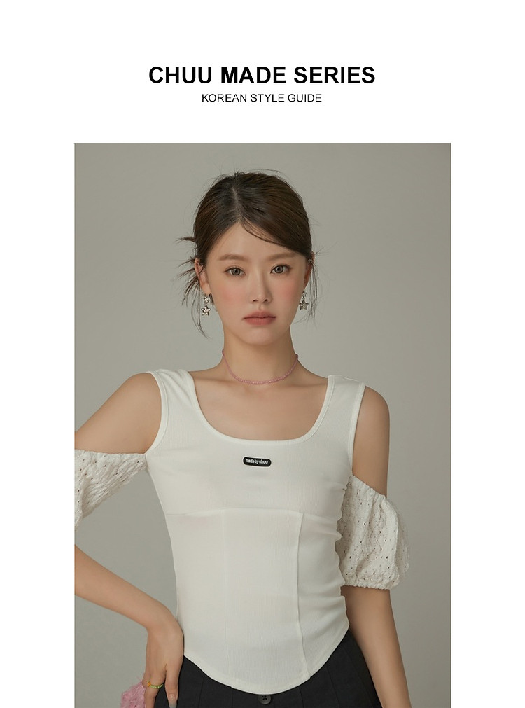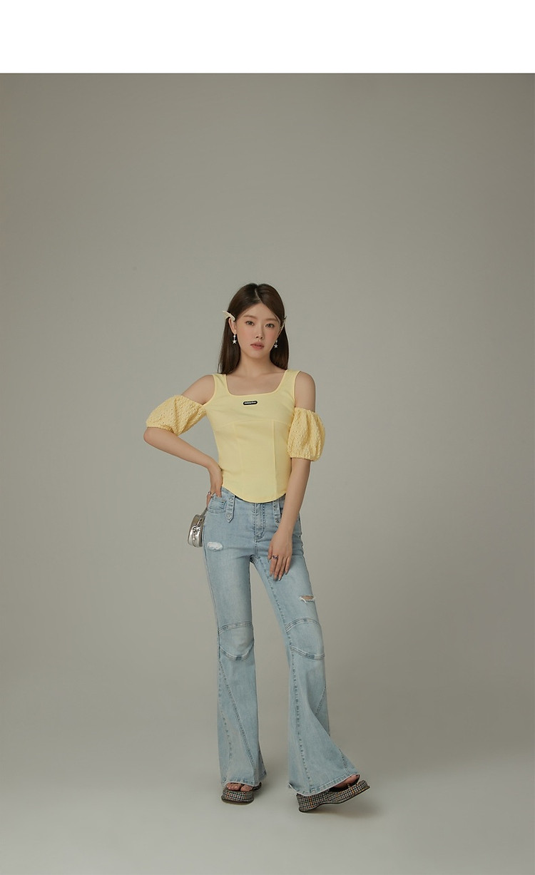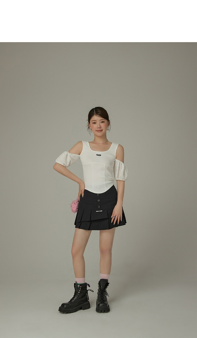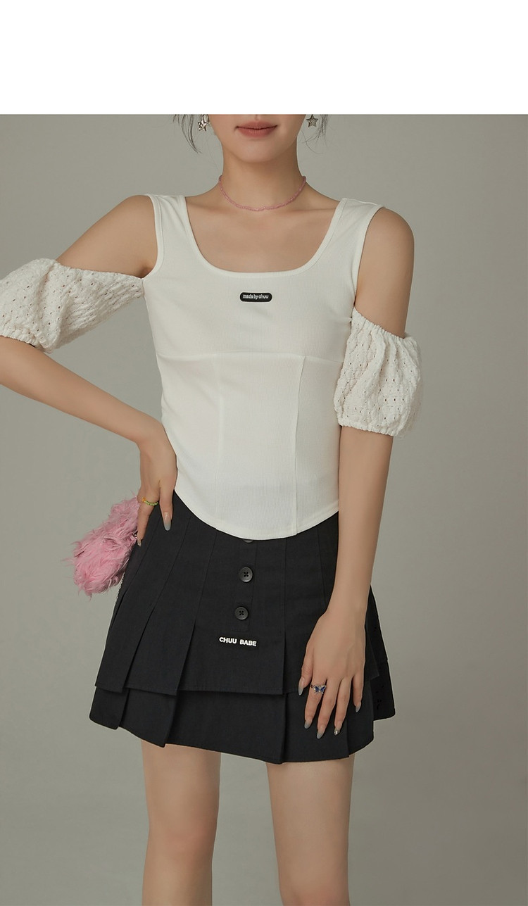 CHUU露肩雪纺衫女夏褶皱镂空拼接泡泡袖短款上衣 789907