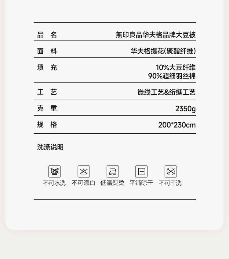 商品名称:无印良品华夫格品牌大豆被200*230cm 2350g