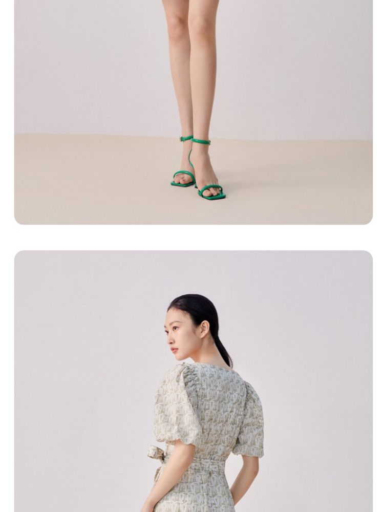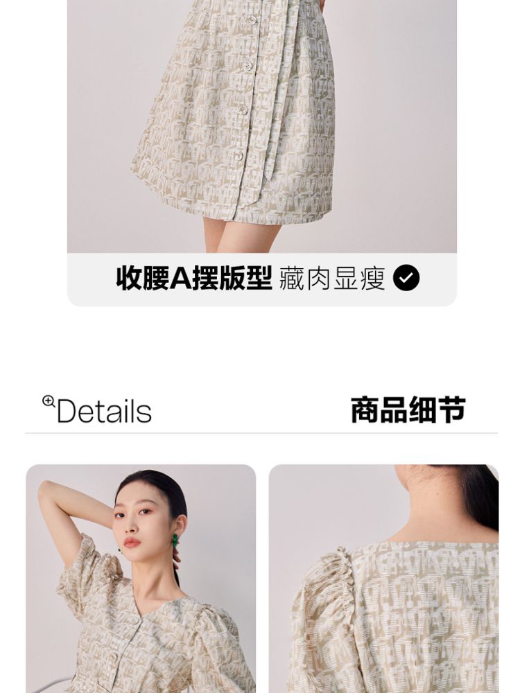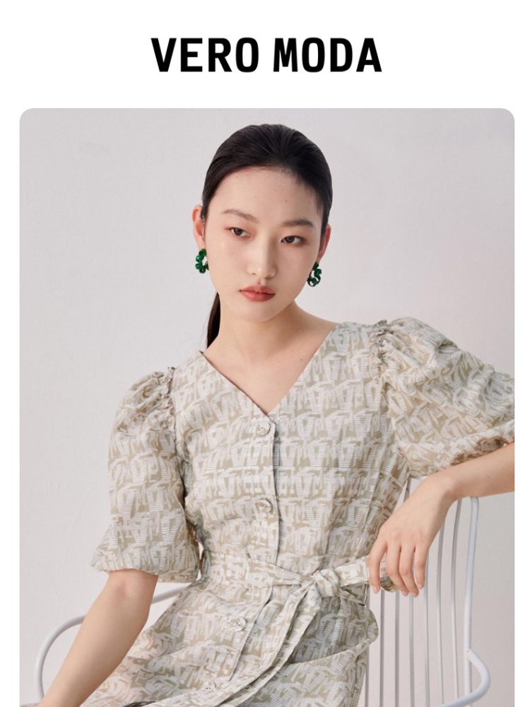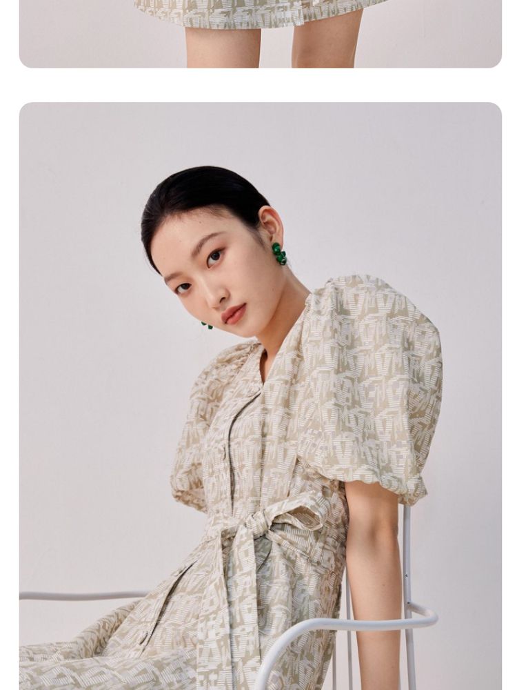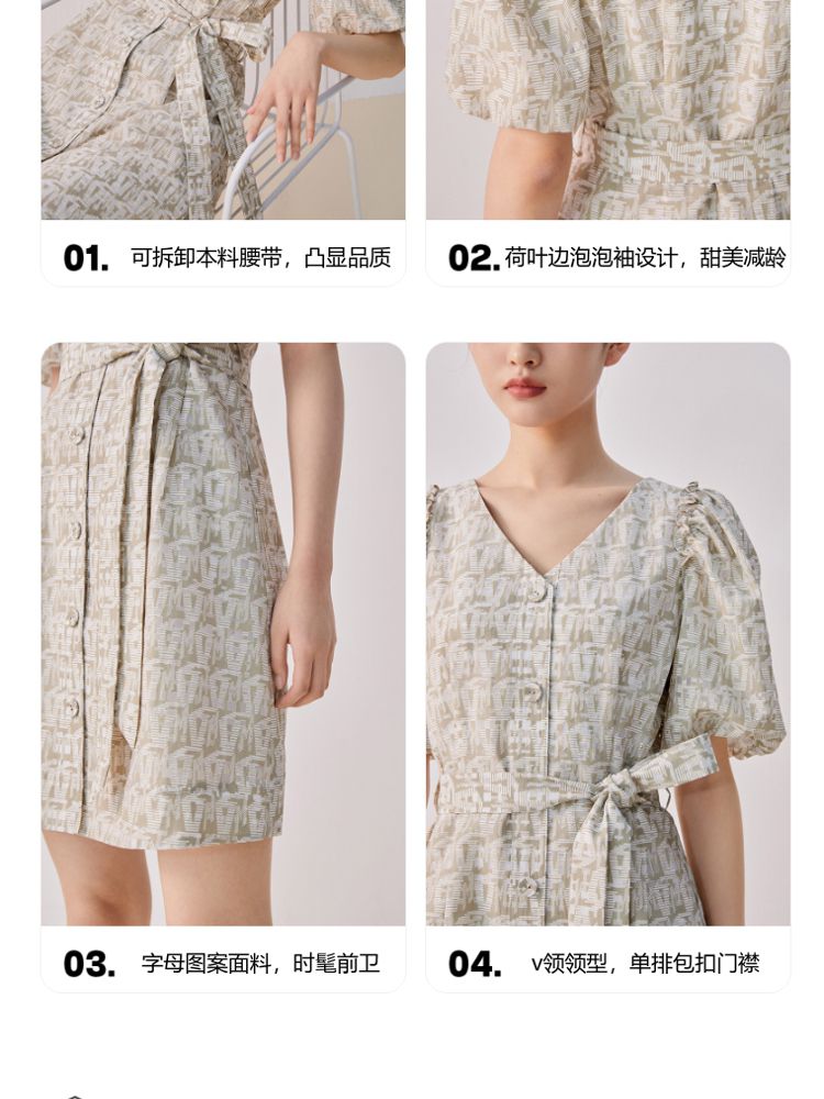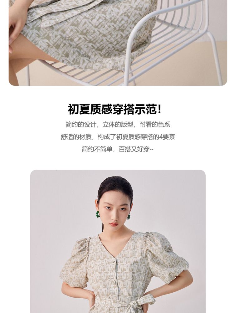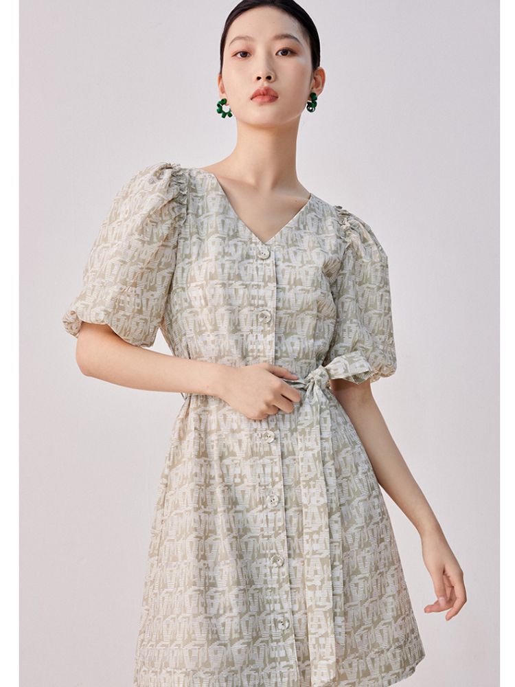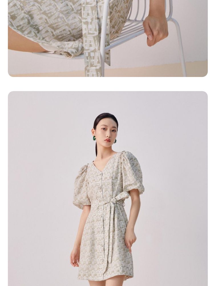 收腰A摆v领印花泡泡袖优雅连衣裙气质百搭时尚春夏 696145