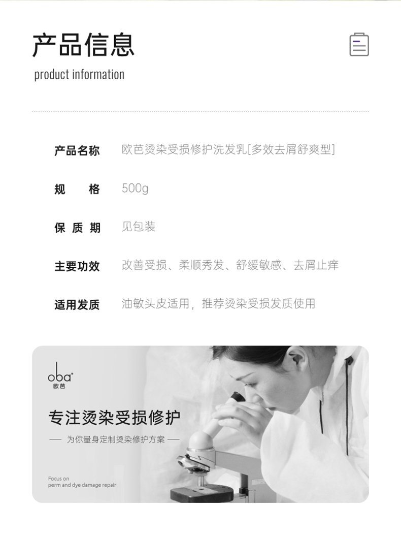 商品名称:oba/欧芭多效去屑舒爽型烫染受损修护洗发乳500g