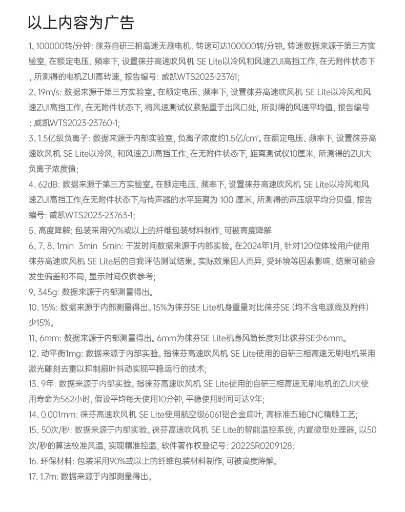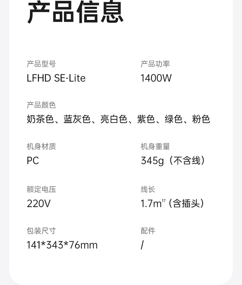 商品名称:【京东/顺丰配送】Laifen/徕芬家用高速吹风机SE-lite