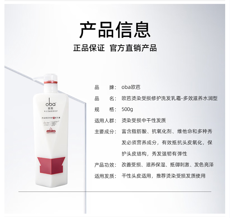 商品名称:oba/欧芭多效滋养水润型烫染受损修护洗发乳霜500g