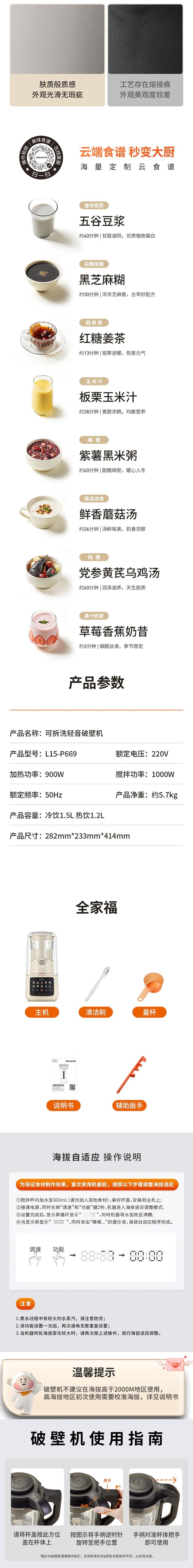 商品名称:九阳 可拆洗破壁机L15-P669 低音家用易清洗破壁机 全自动五谷杂粮豆浆机1.5L大容量