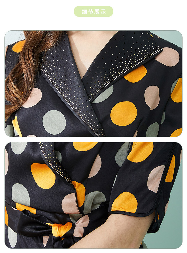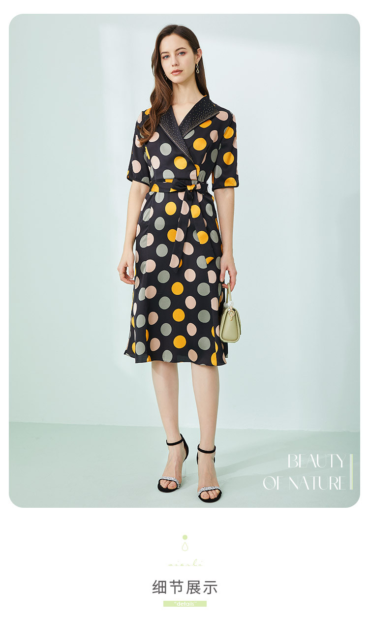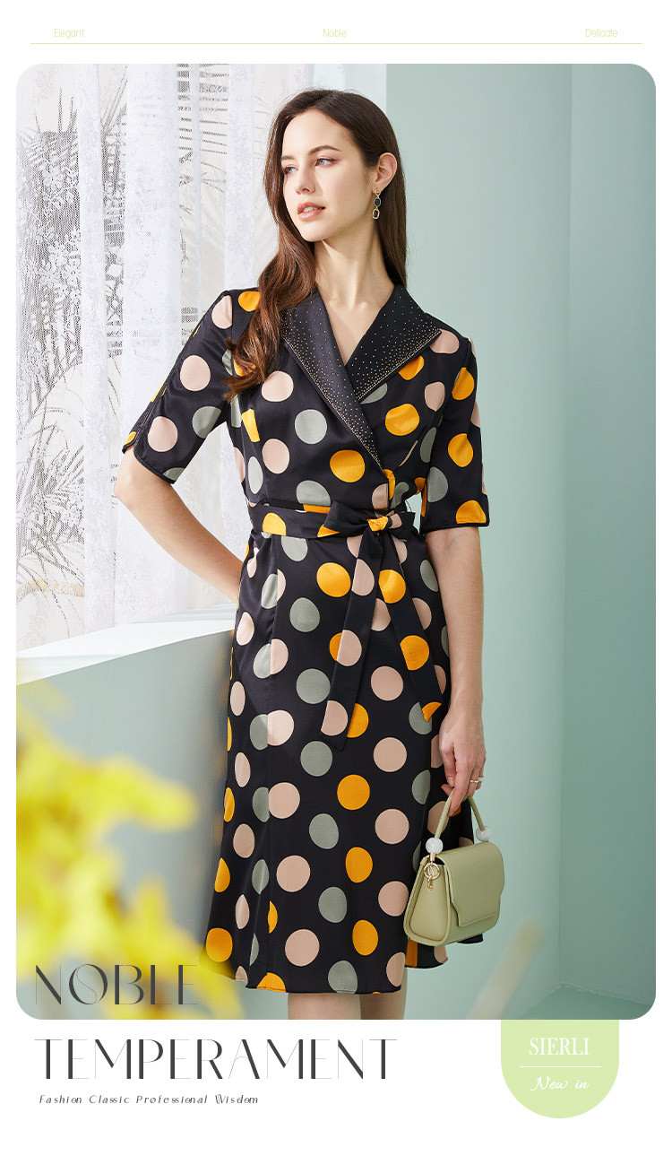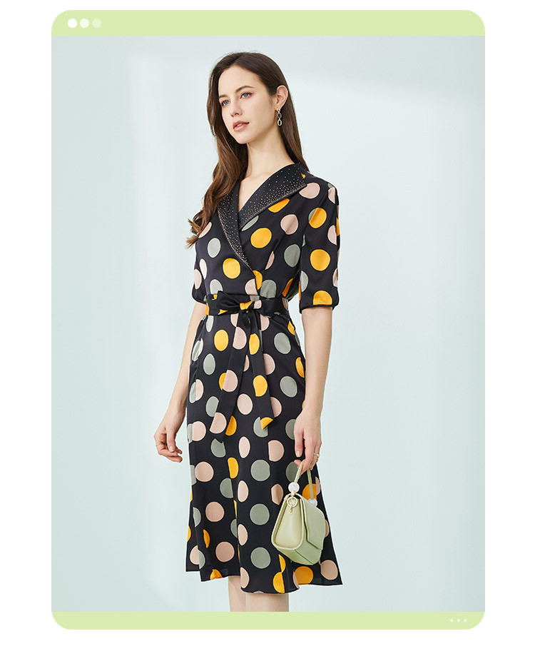 商品名称:商场同款秋季复古优雅撞色大波点印花西装翻领收腰5分袖连衣裙 271519