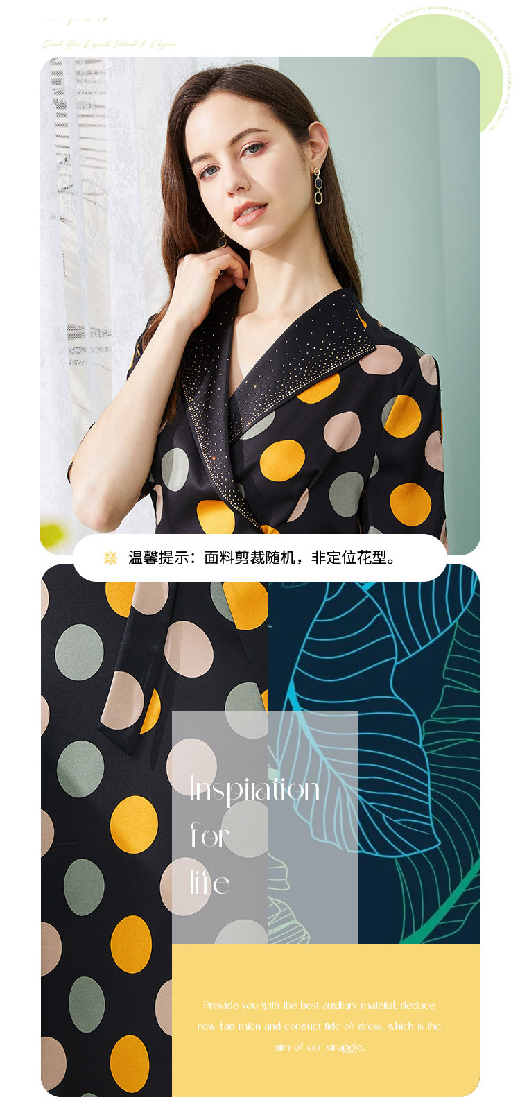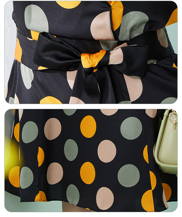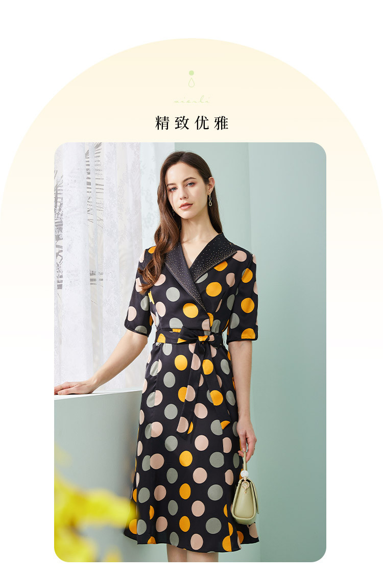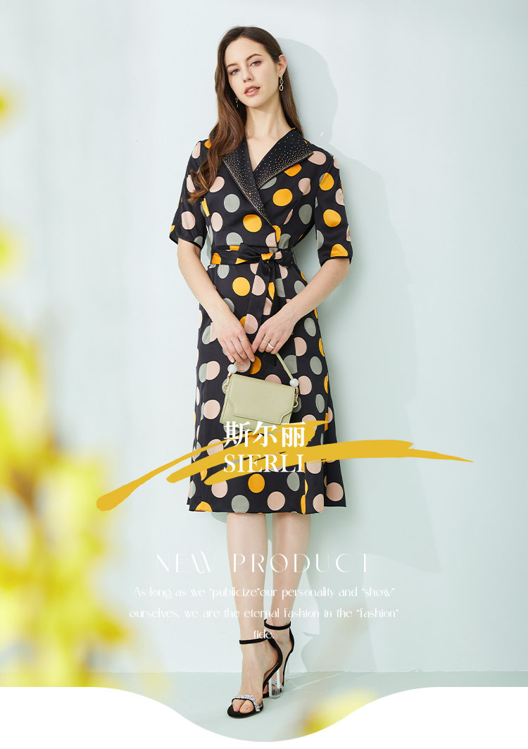 商品名称:商场同款秋季复古优雅撞色大波点印花西装翻领收腰5分袖连衣裙 271519