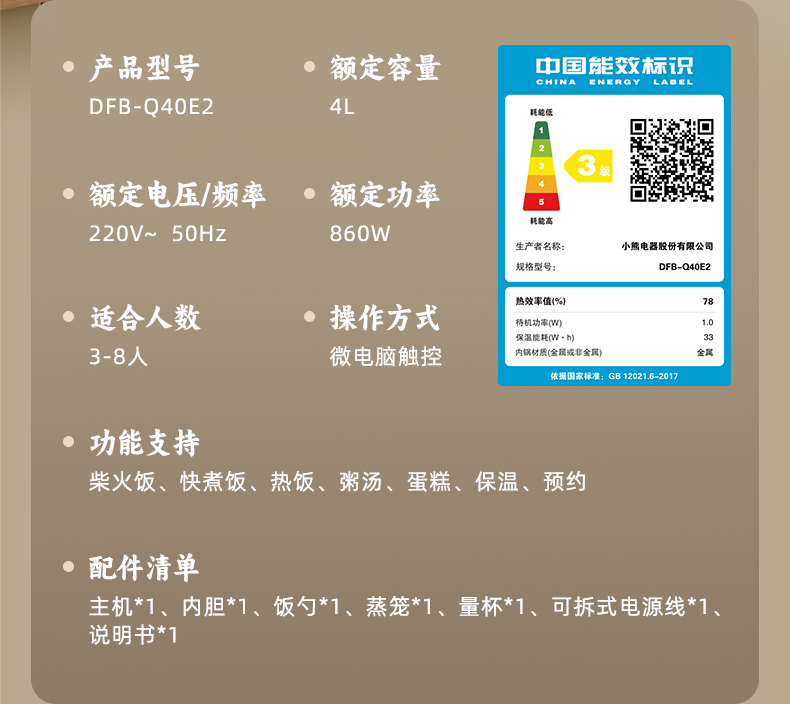 商品名称:Bear/小熊4升电饭煲DFB-Q40E2