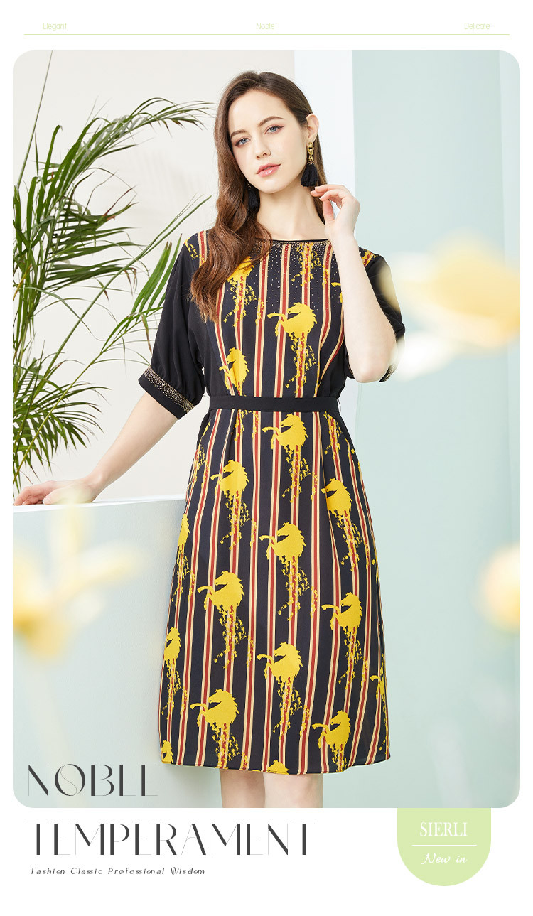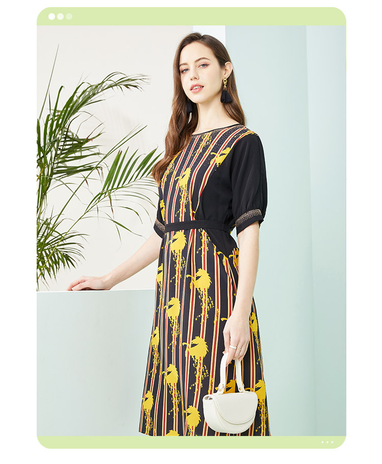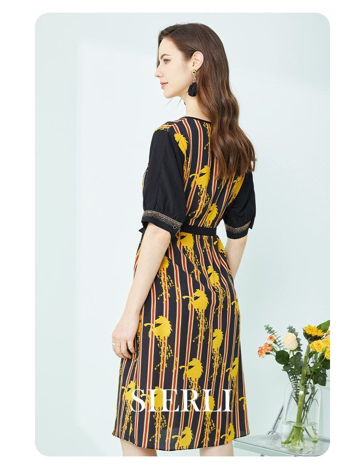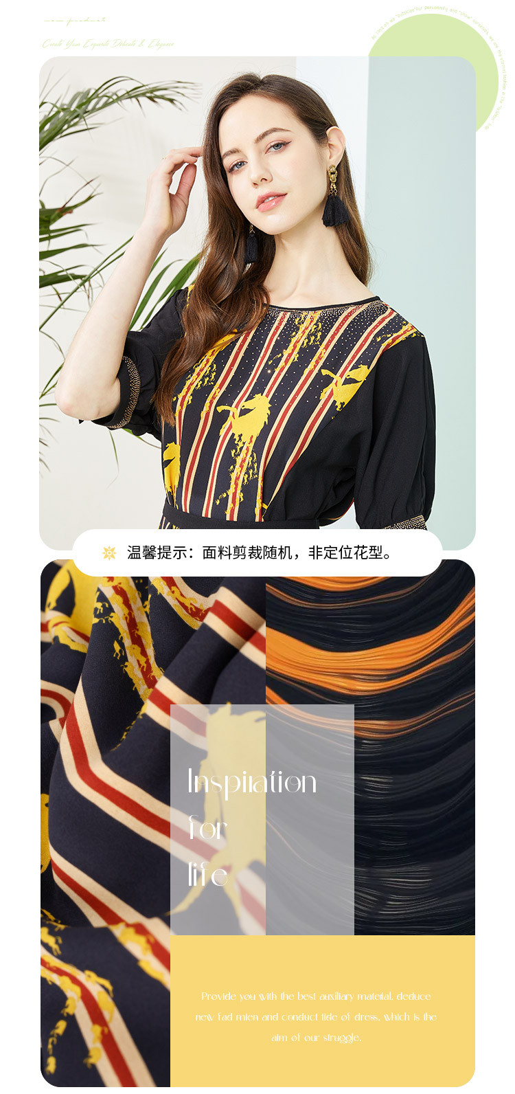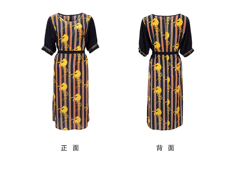 商品名称:商场同款春季复古飞马印花蝙蝠袖撞色系腰带圆领连衣裙 790047
