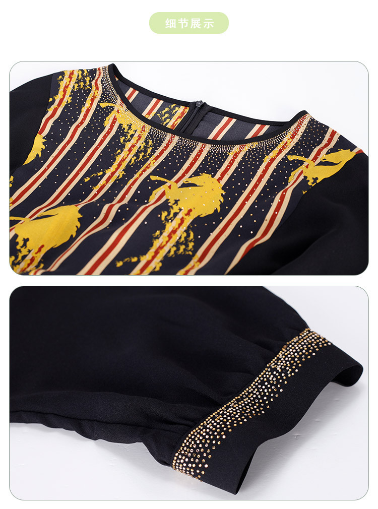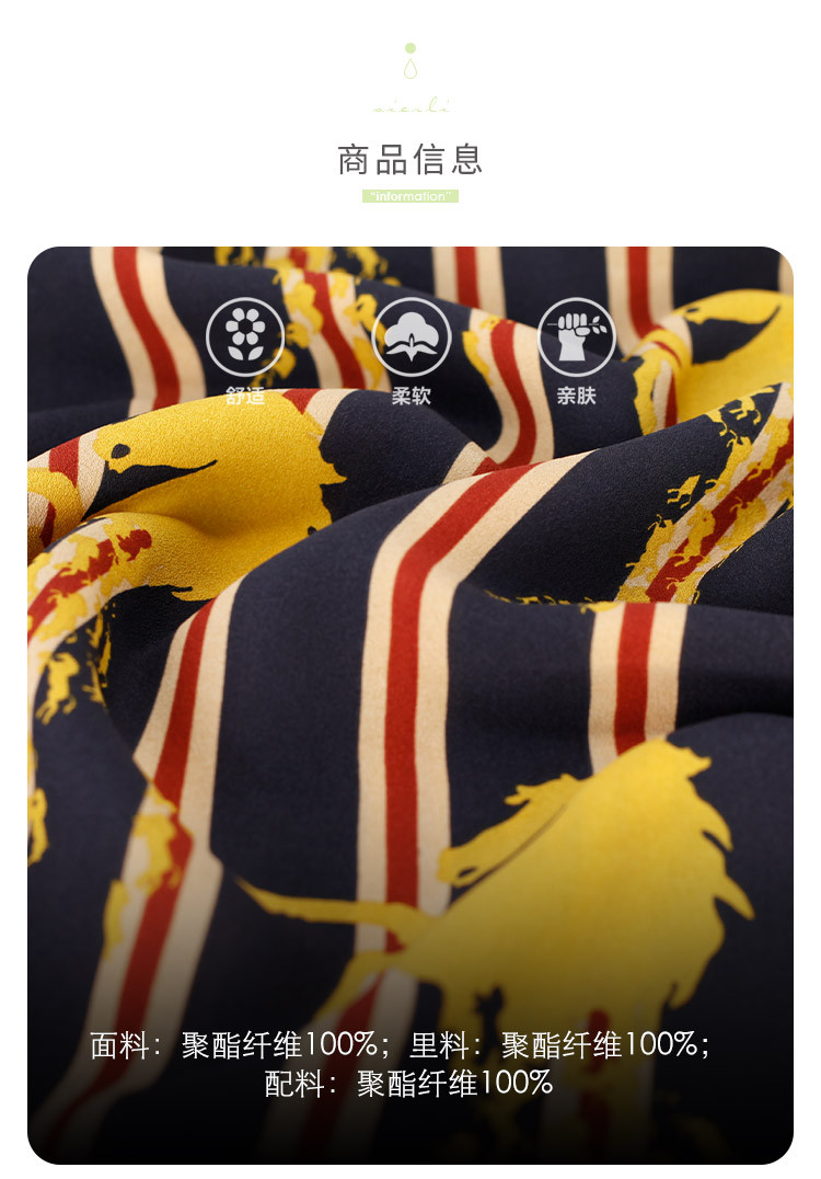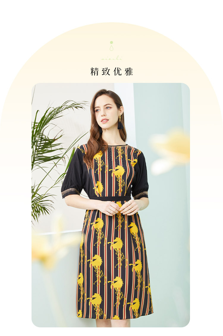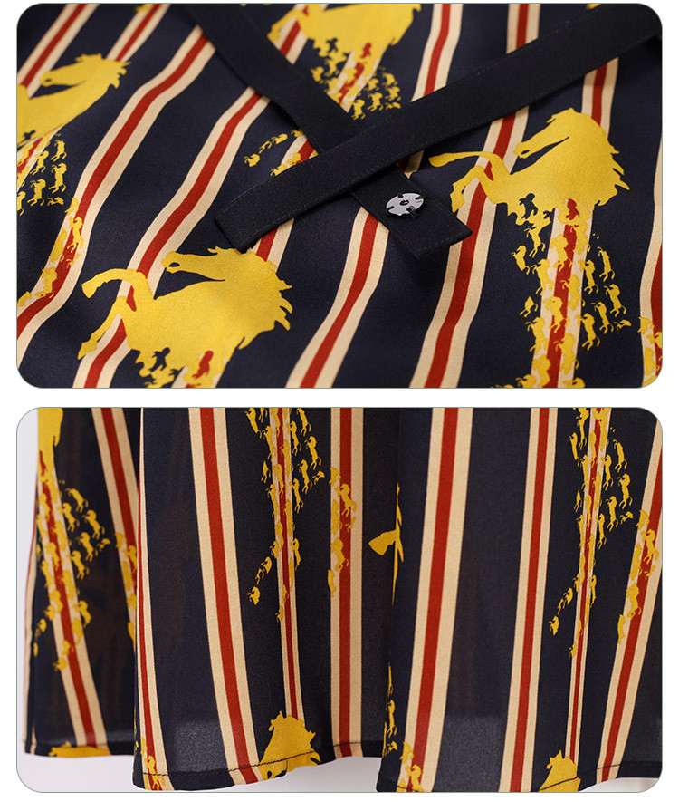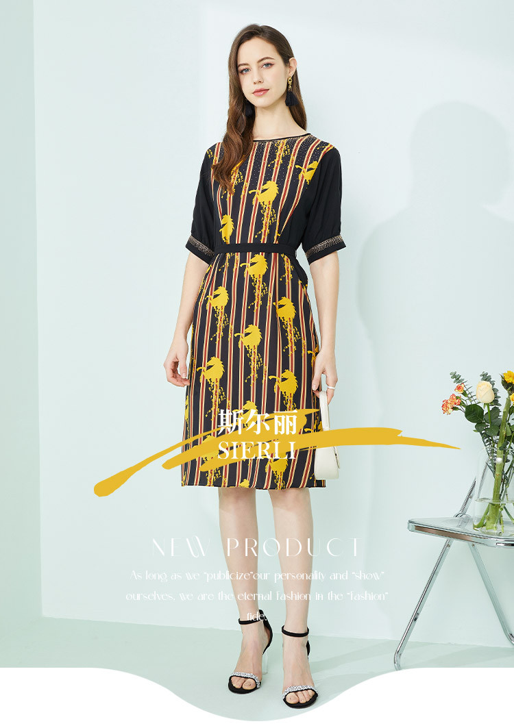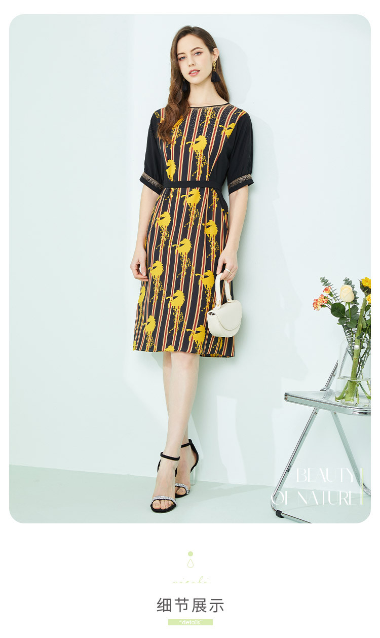 商品名称:商场同款春季复古飞马印花蝙蝠袖撞色系腰带圆领连衣裙 790047