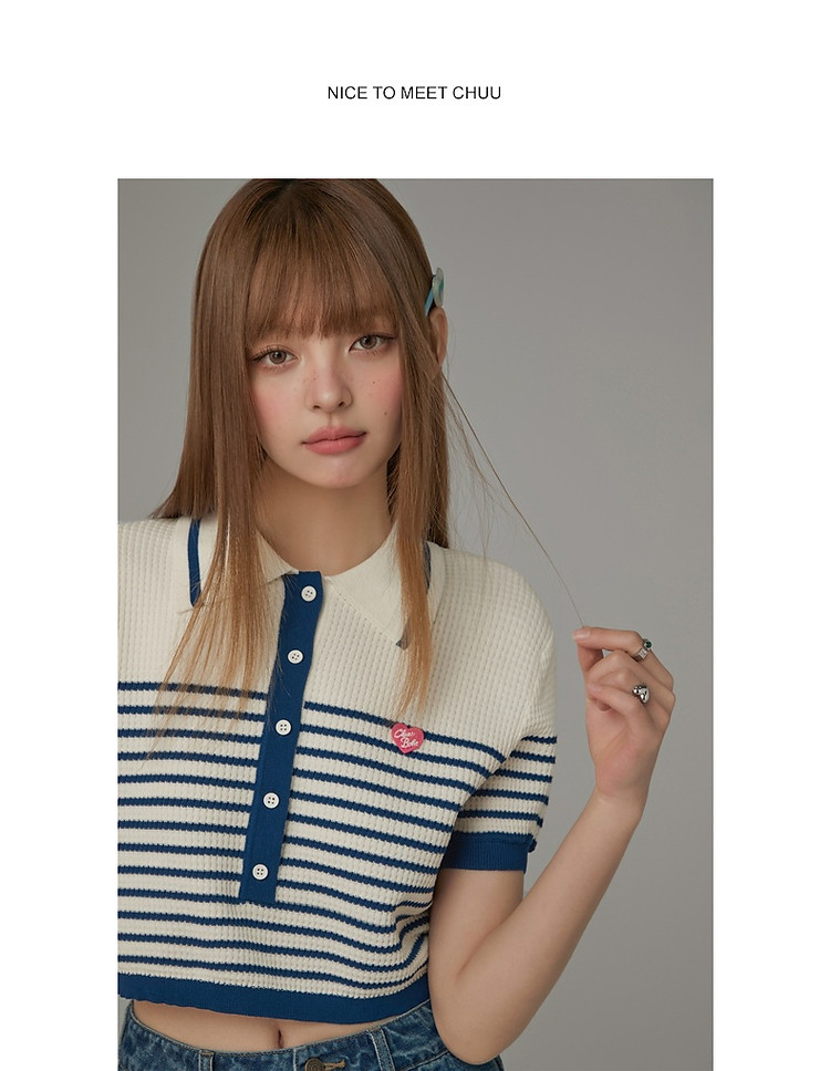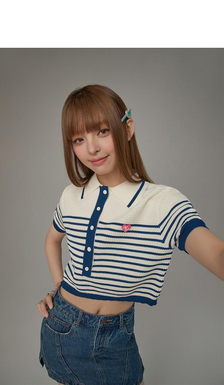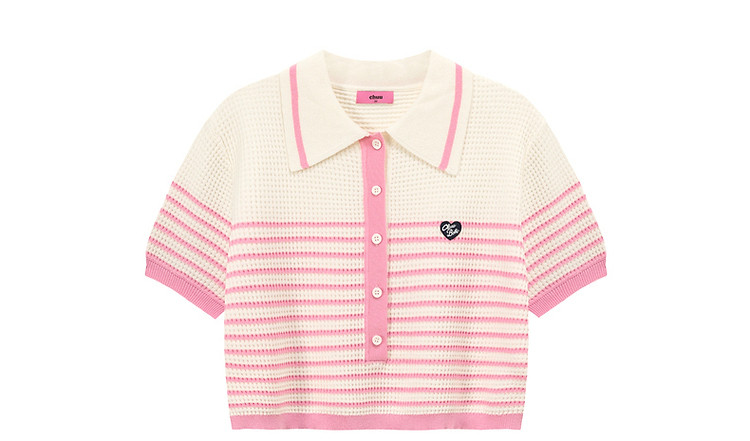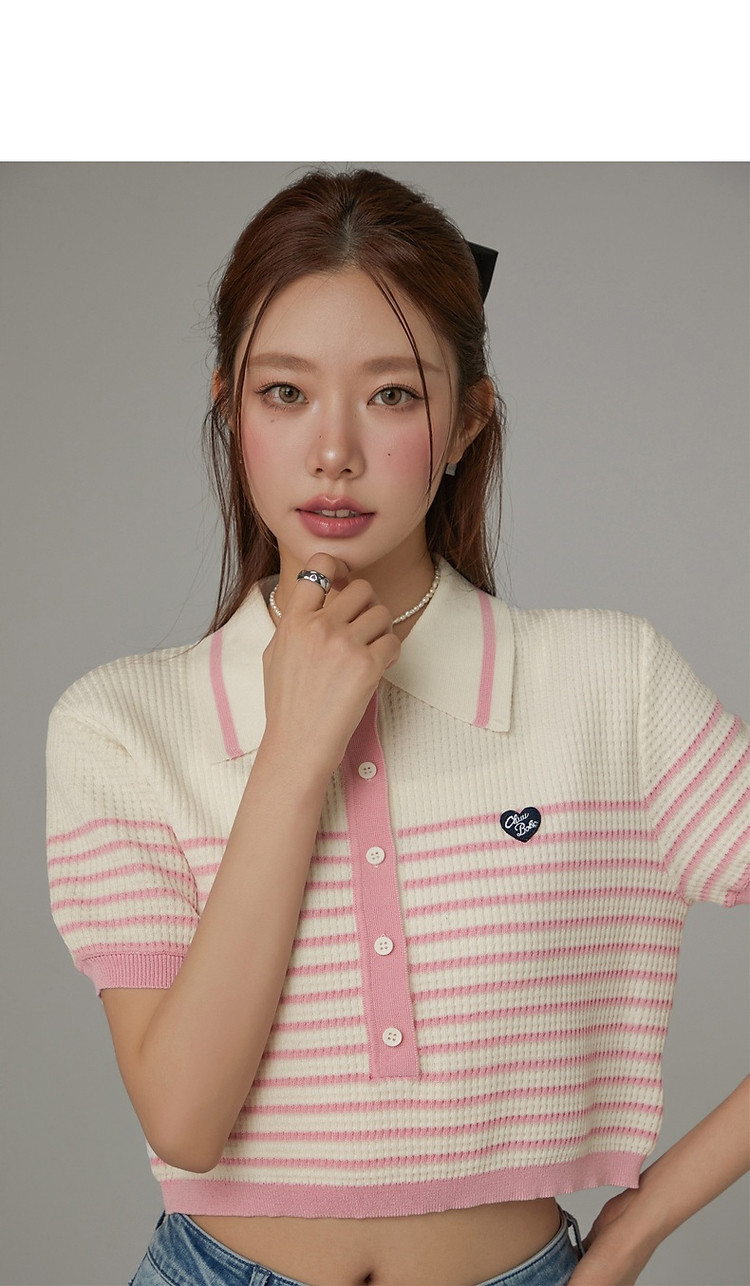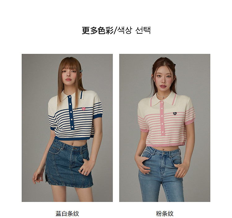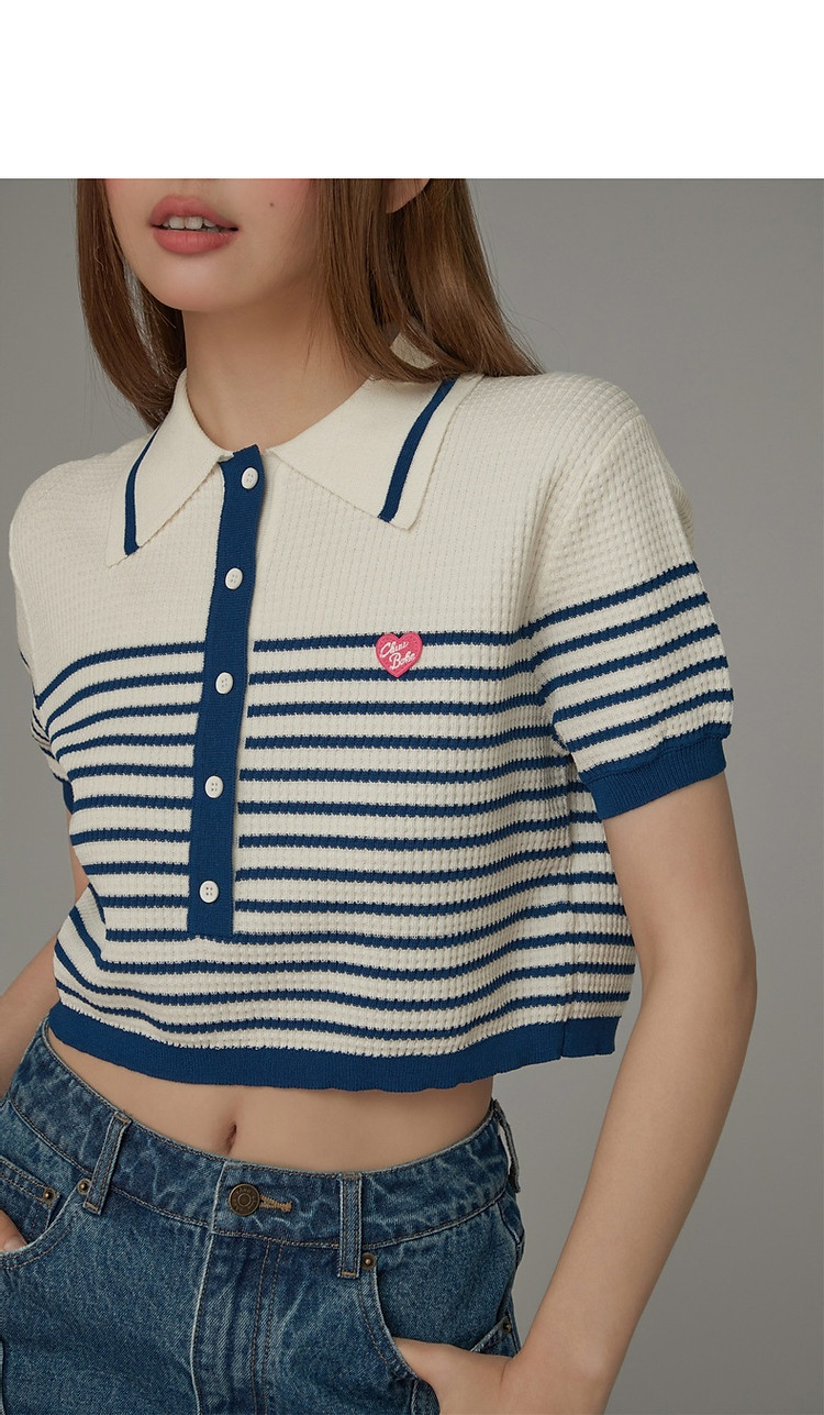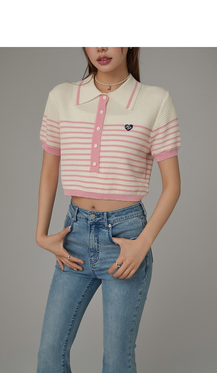 商品名称:条纹短袖针织衫女2025夏甜美减龄洋气翻领爱心短款 820563