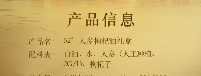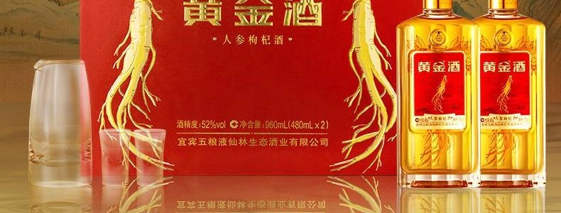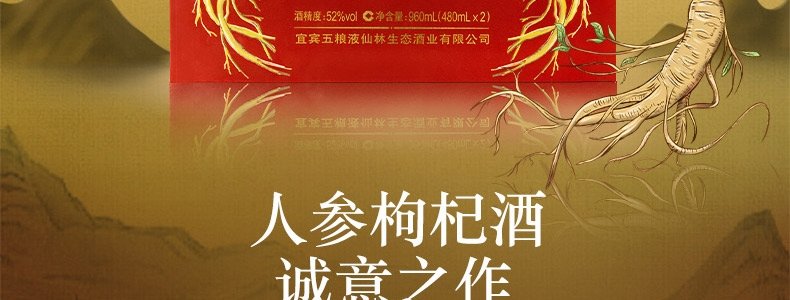 商品名称:五粮液 仙林生态 黄金酒人参枸杞酒 52度白酒 480ml*2瓶