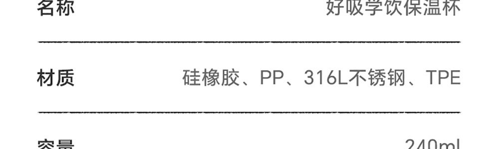 商品名称:皇宠 好吸奶瓶吸管保温杯 240ml 适用6月+ 无背带