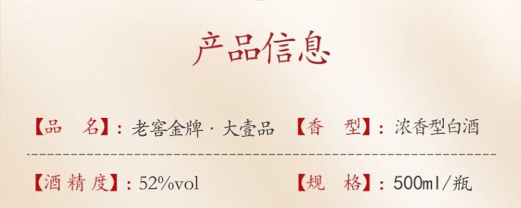 商品名称:泸州老窖 老窖金牌大壹品 52度浓香型白酒 500ml*6瓶