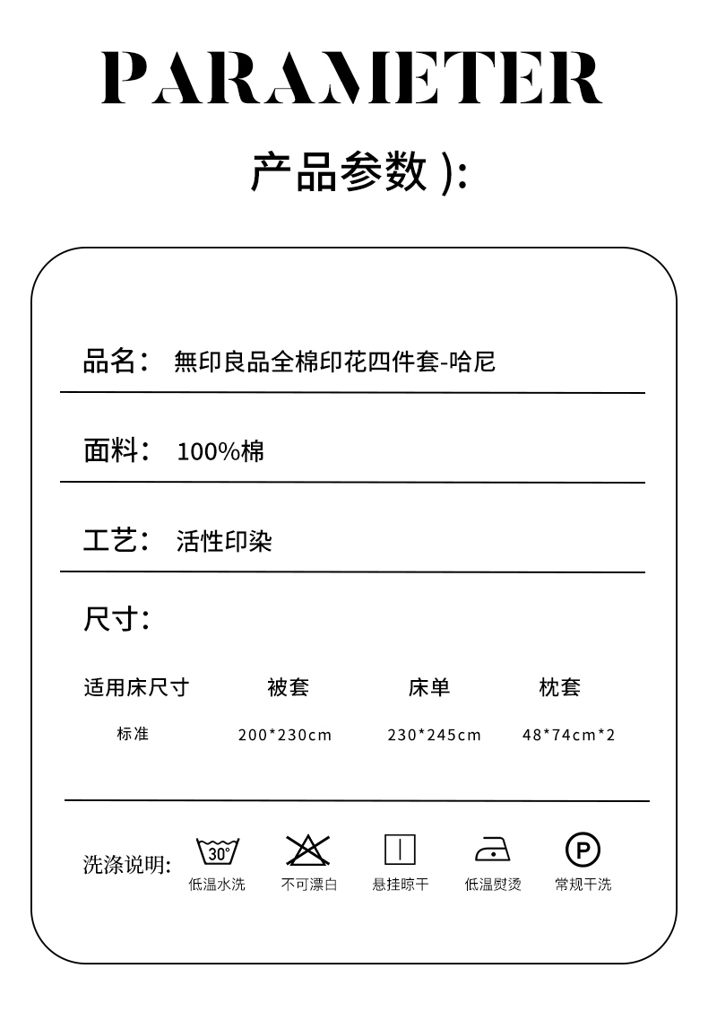 商品名称:无印良品哈尼全棉印花床品四件套200*230cm