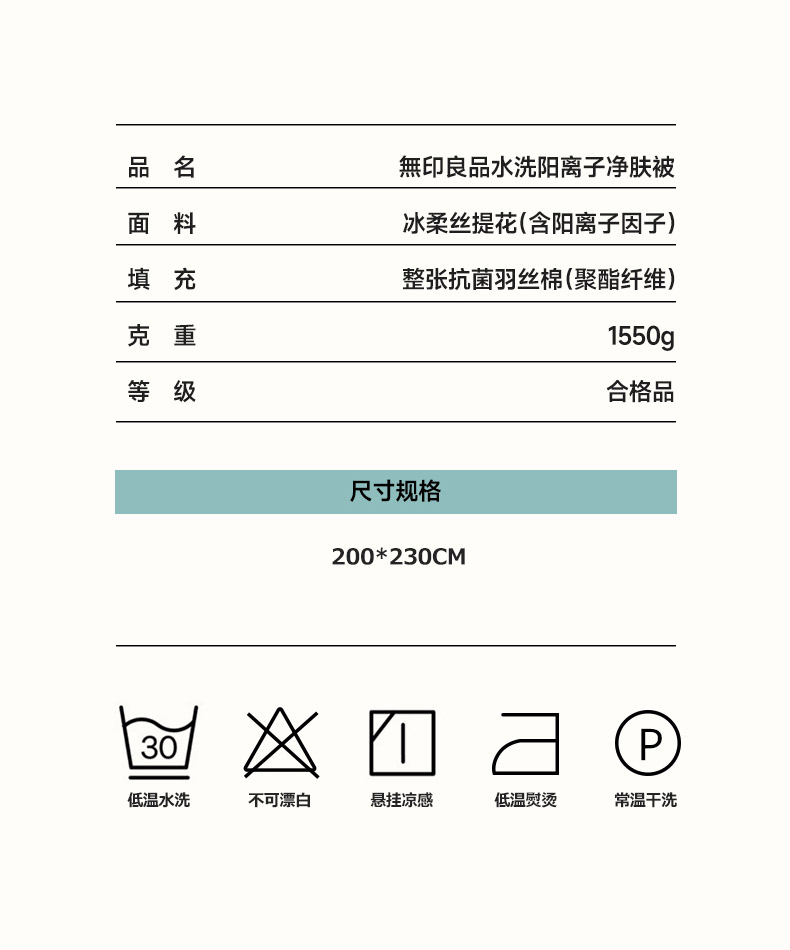 商品名称:无印良品水洗阳离子净肤被200*230cm 1550g