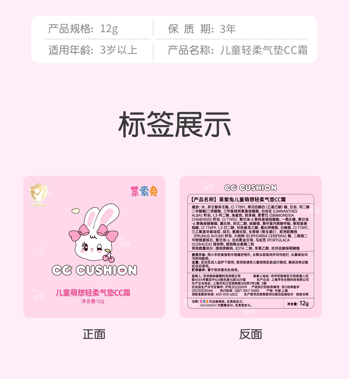 商品名称:莱索兔 儿童萌想轻柔气垫CC霜12g/盒