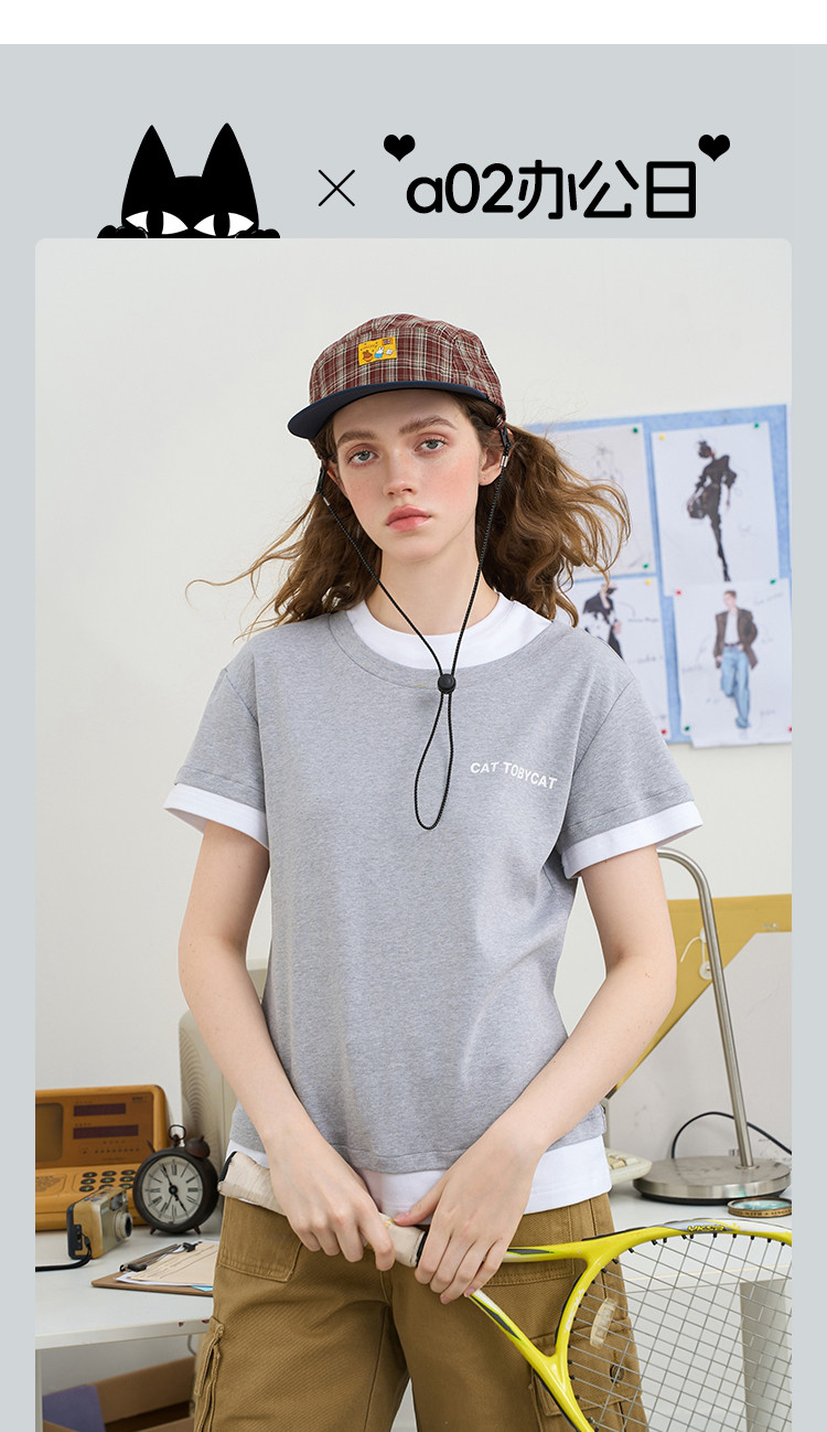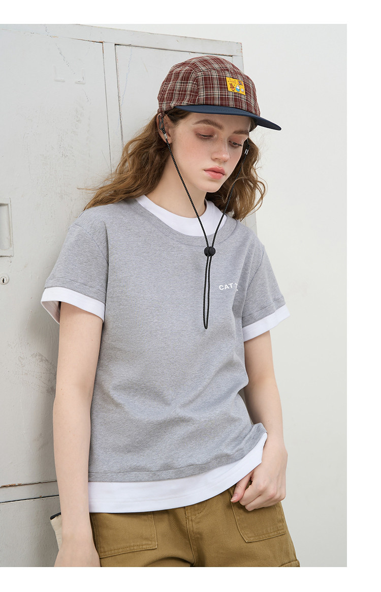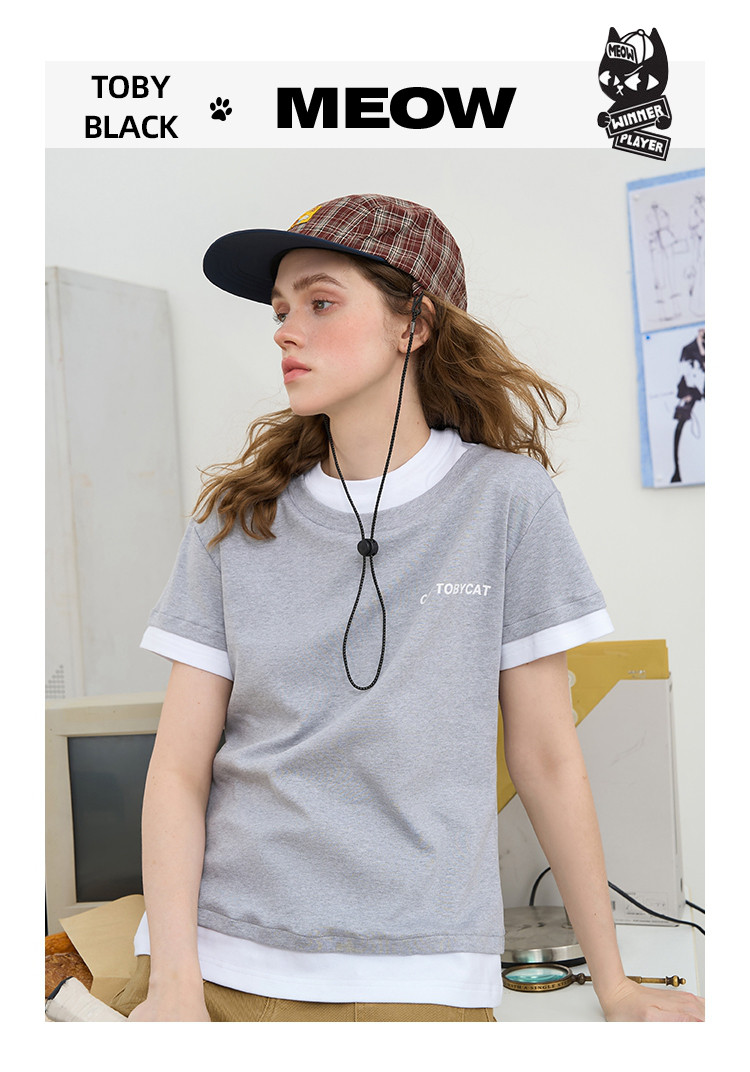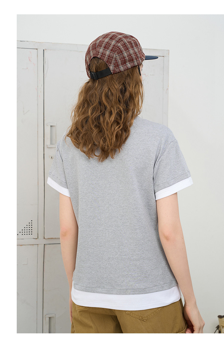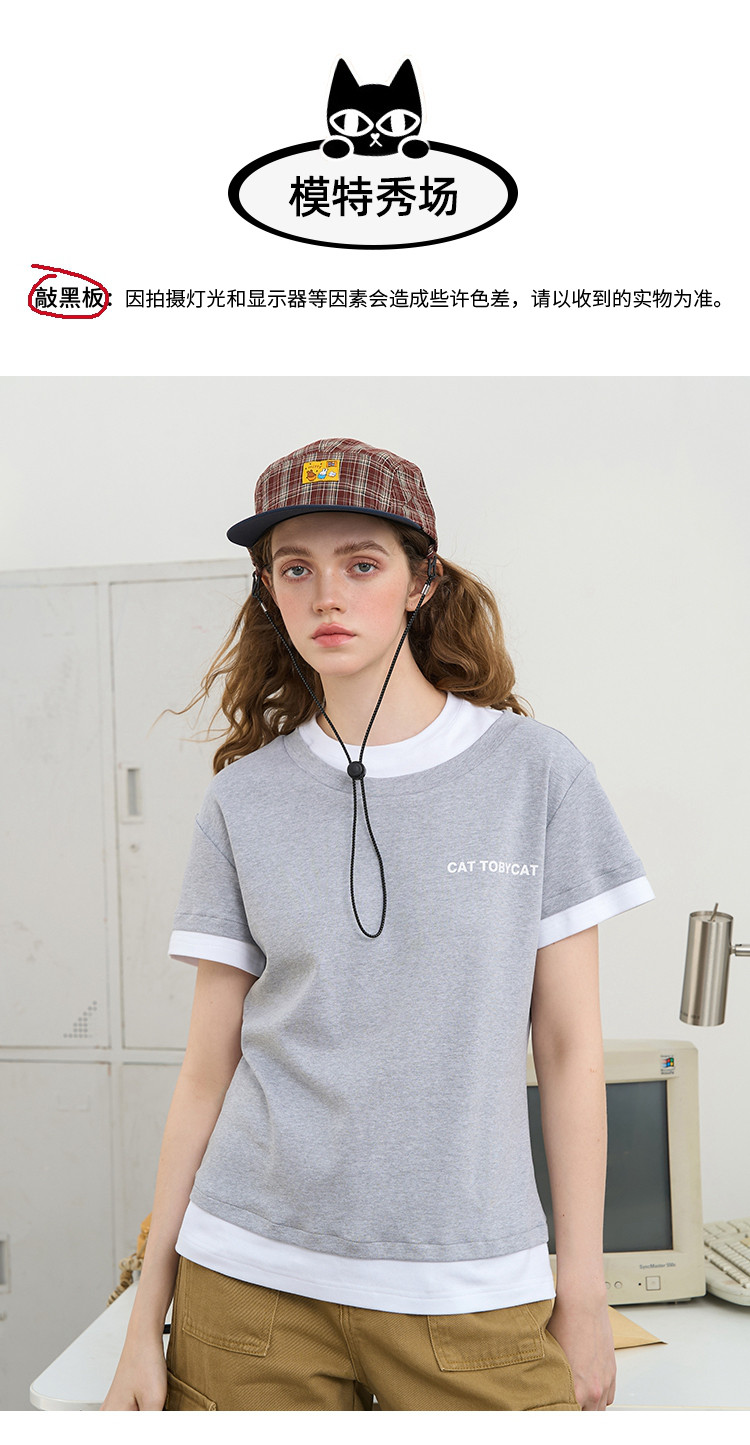 商品名称:假两件拼接简约修身印花短袖上衣2025夏季百搭休闲女式T恤 569565