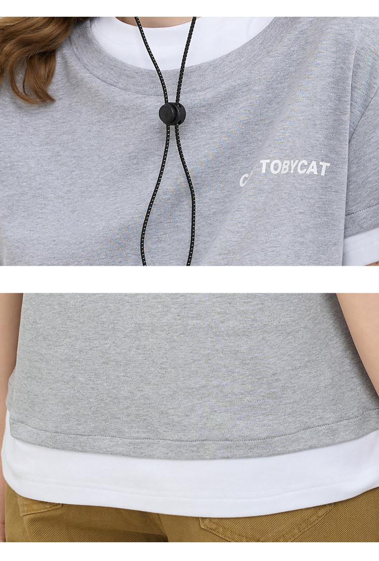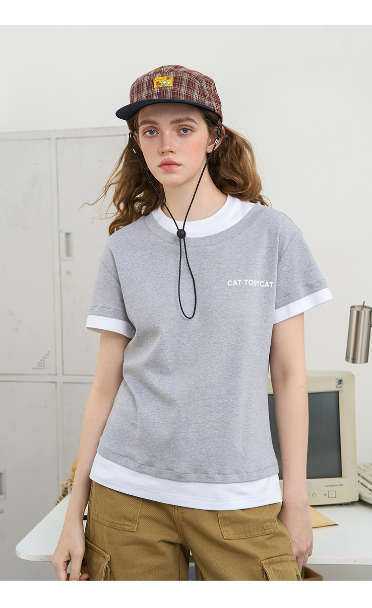 假两件拼接简约修身印花短袖上衣2025夏季百搭休闲女式T恤 569565