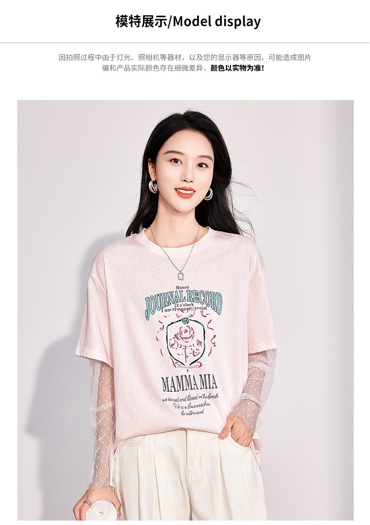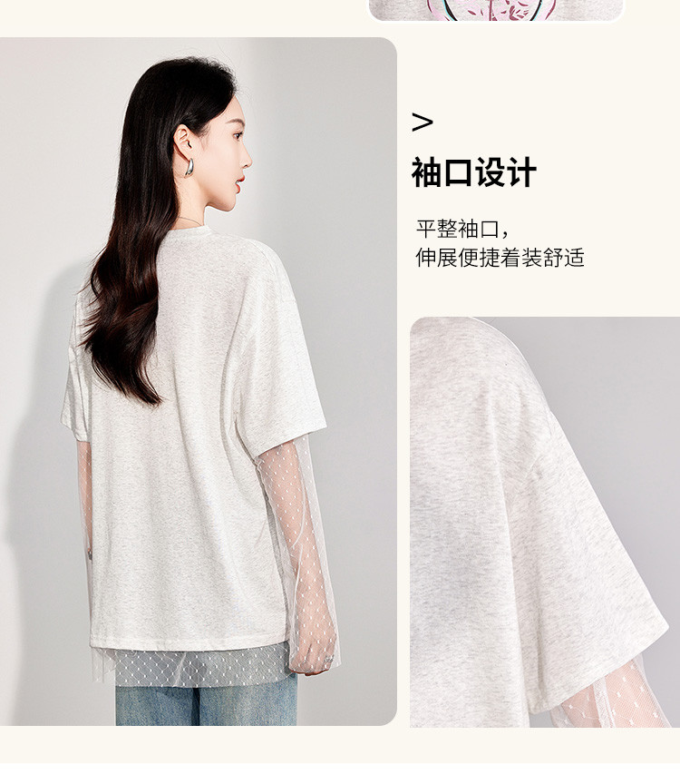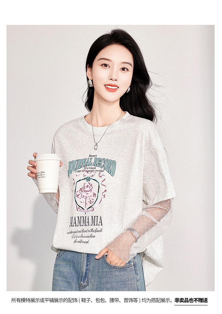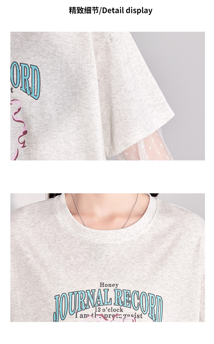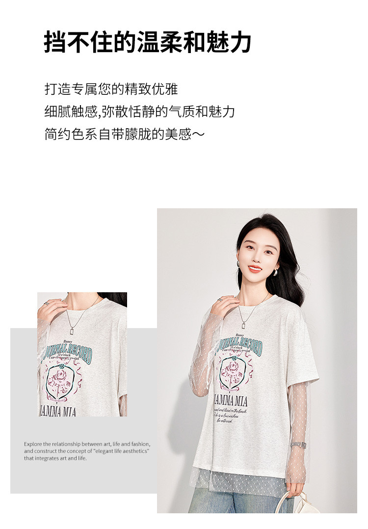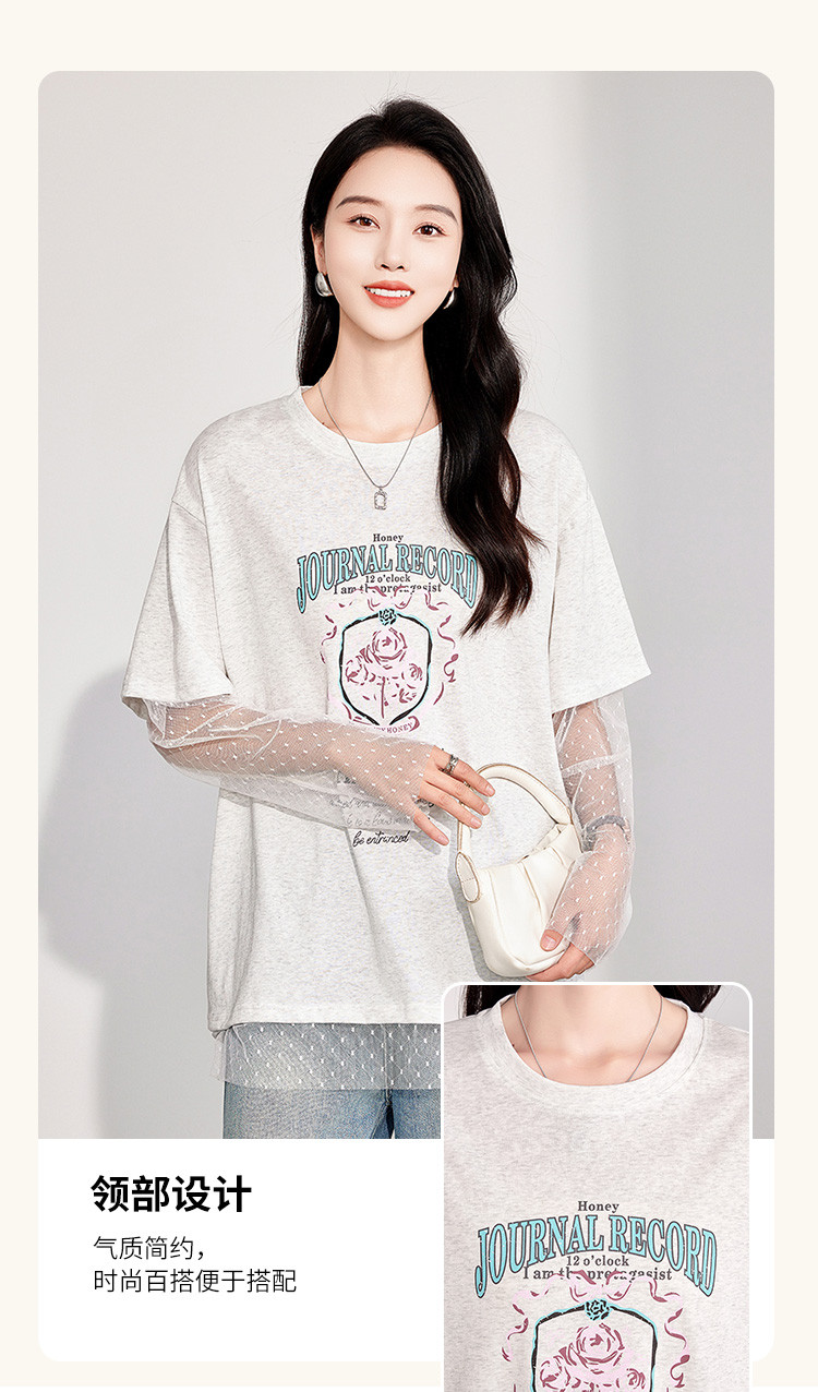 商品名称:【韩系休闲】25夏季新款街头慵懒风拼接蕾丝女时尚T恤上衣 208543