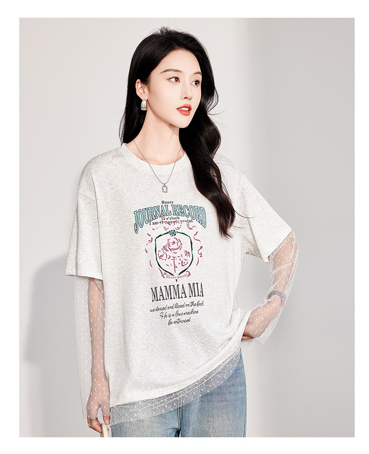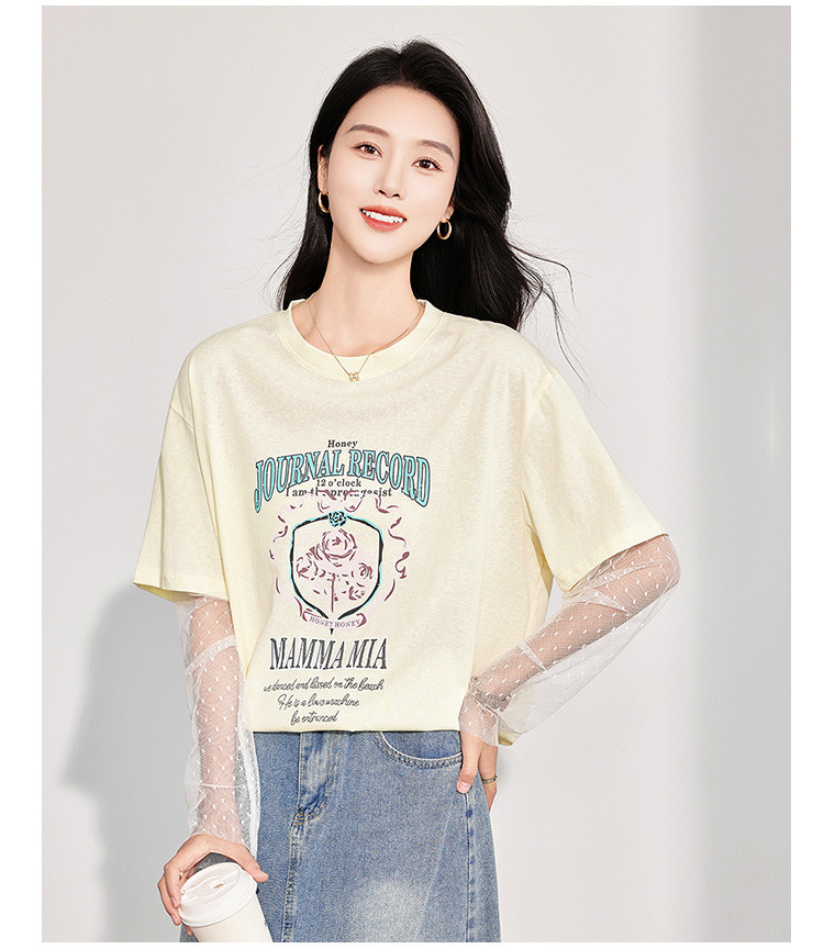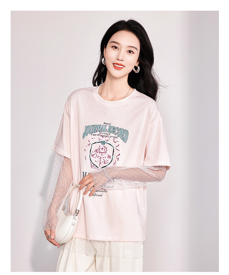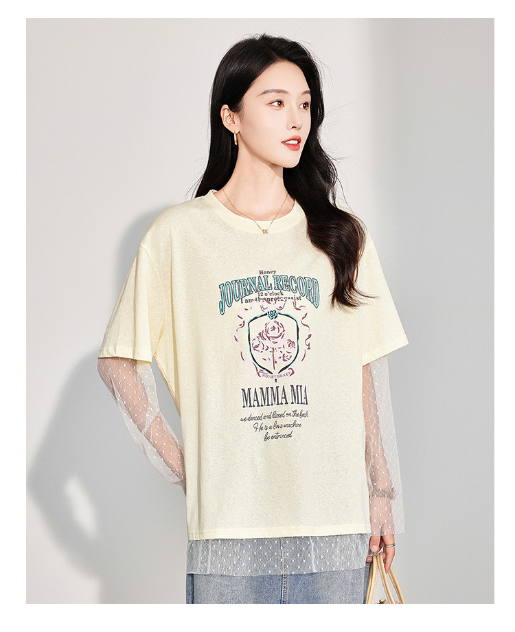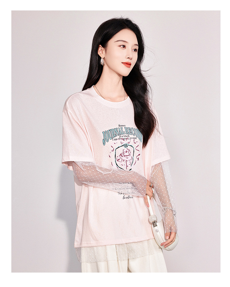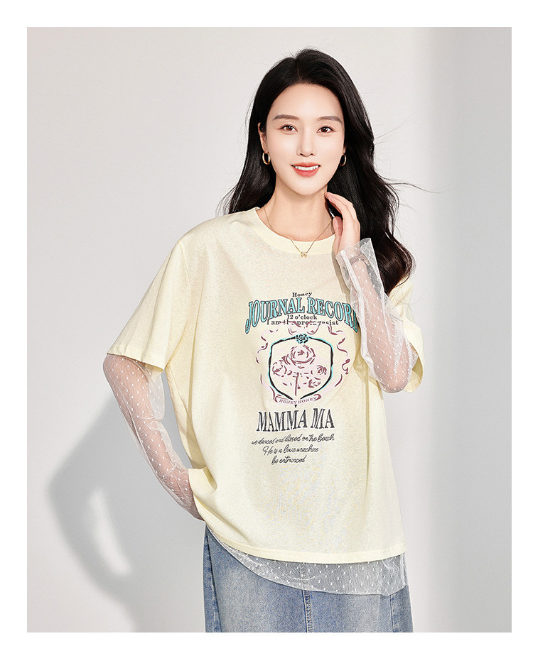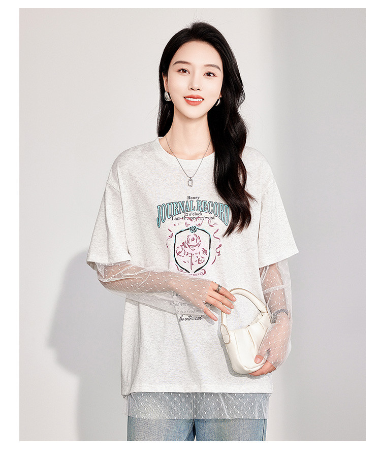 商品名称:【韩系休闲】25夏季新款街头慵懒风拼接蕾丝女时尚T恤上衣 208543
