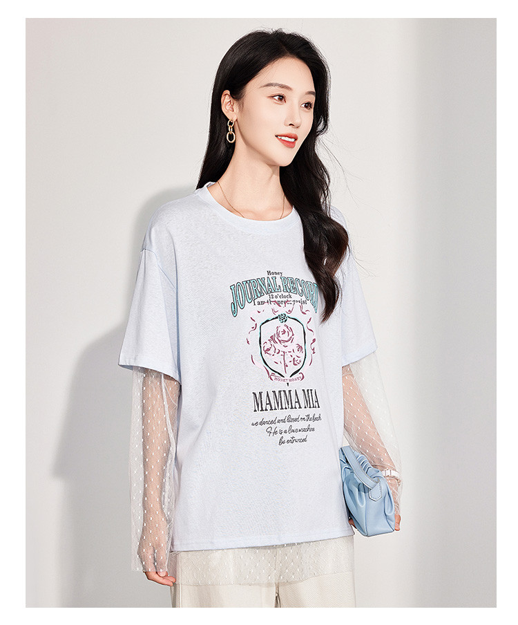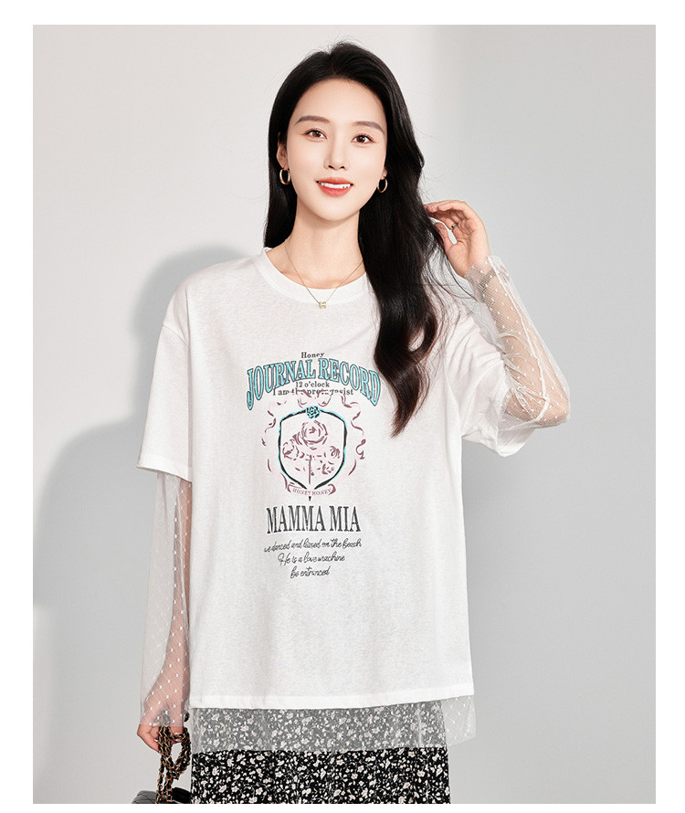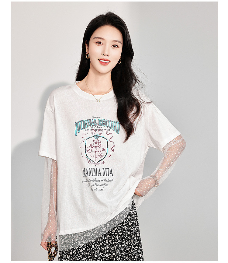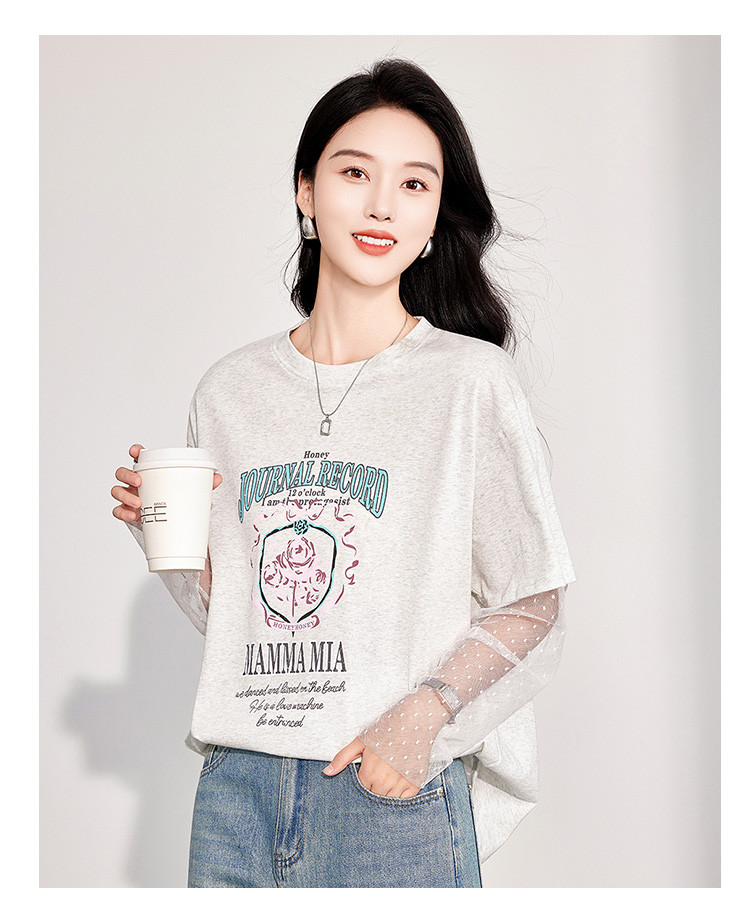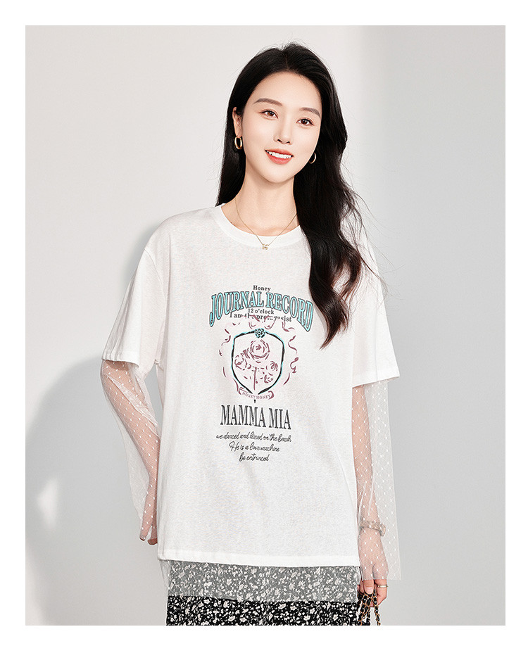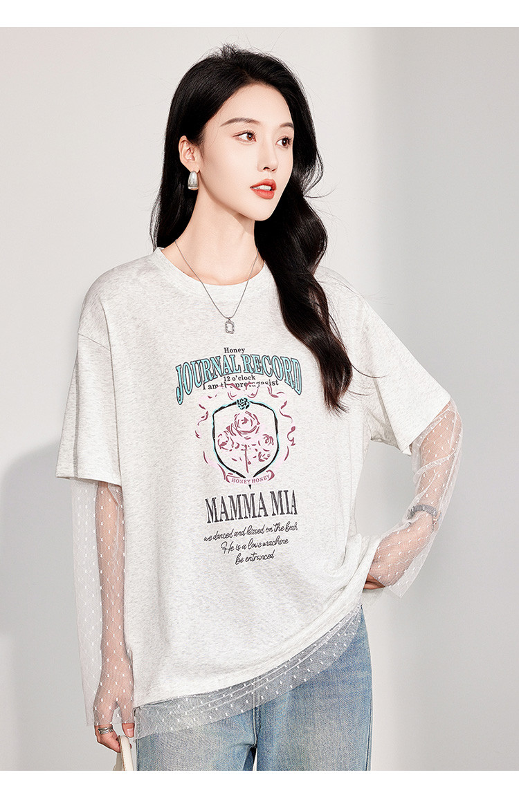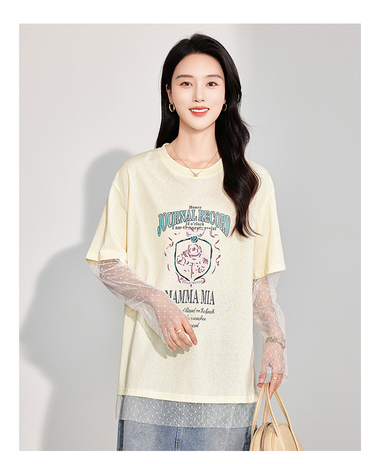 商品名称:【韩系休闲】25夏季新款街头慵懒风拼接蕾丝女时尚T恤上衣 208543