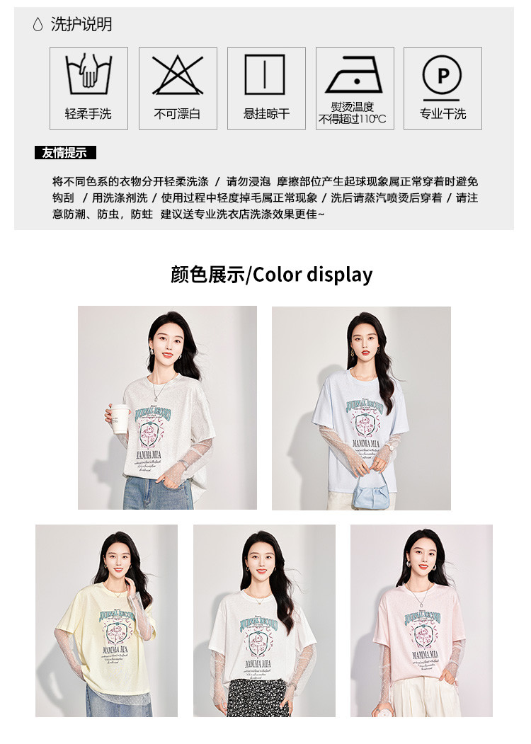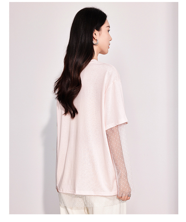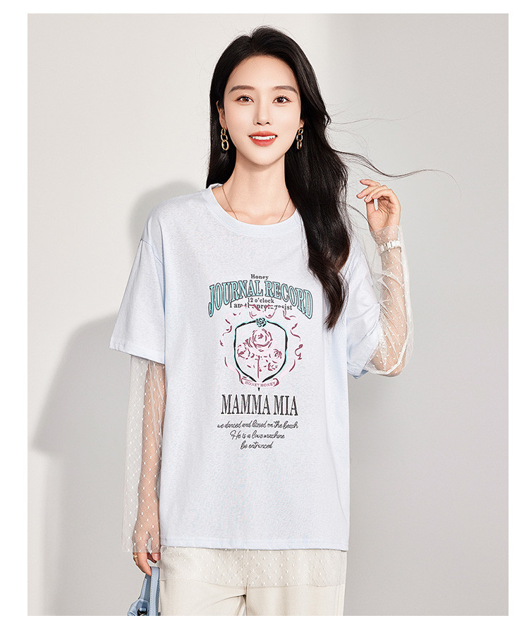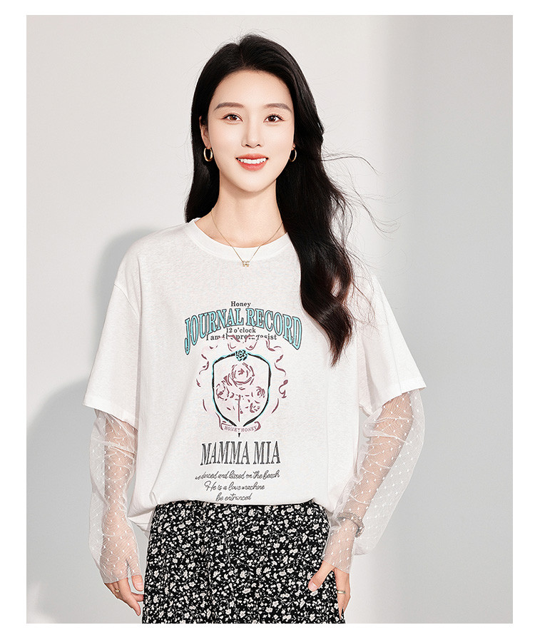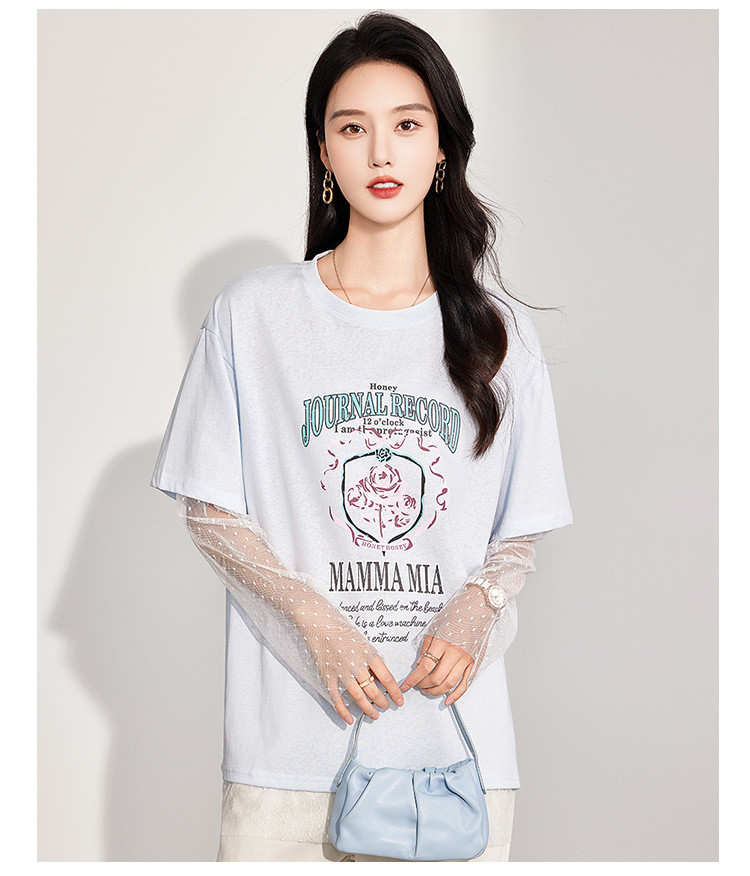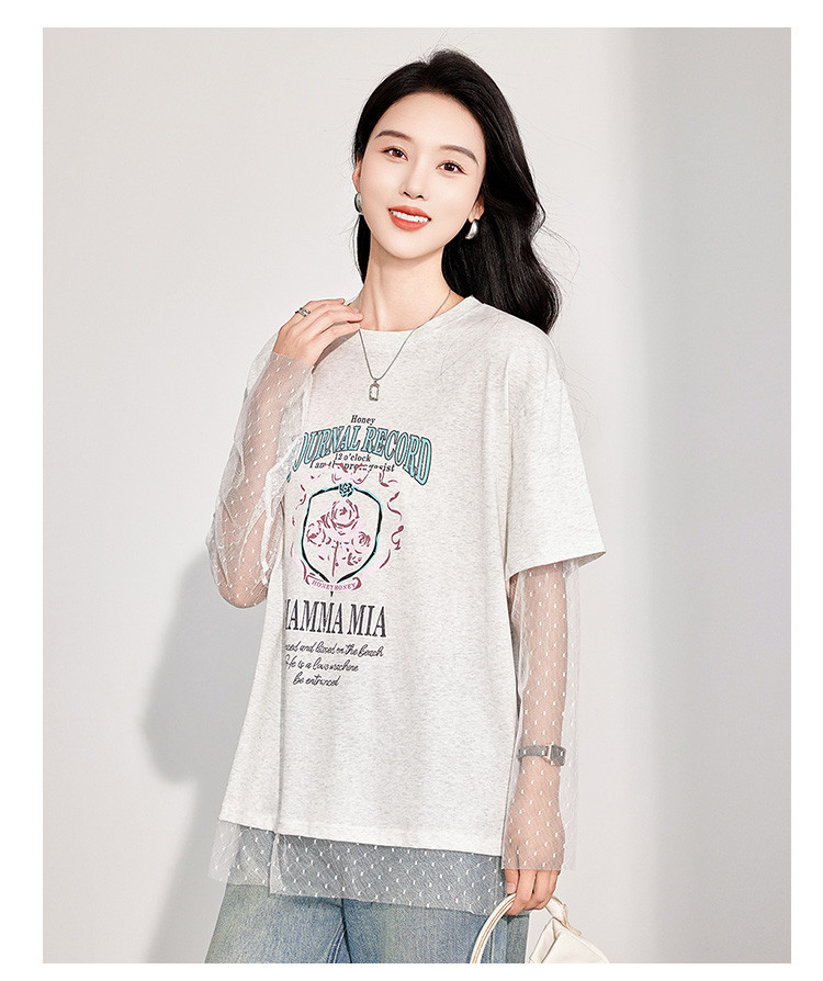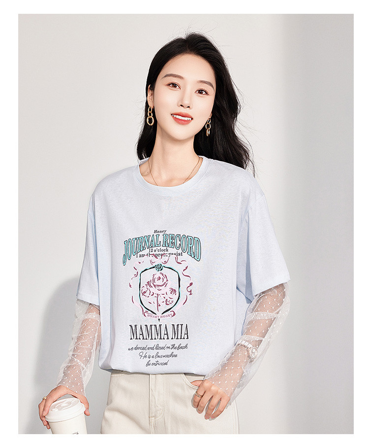 商品名称:【韩系休闲】25夏季新款街头慵懒风拼接蕾丝女时尚T恤上衣 208543