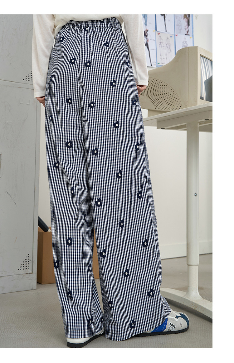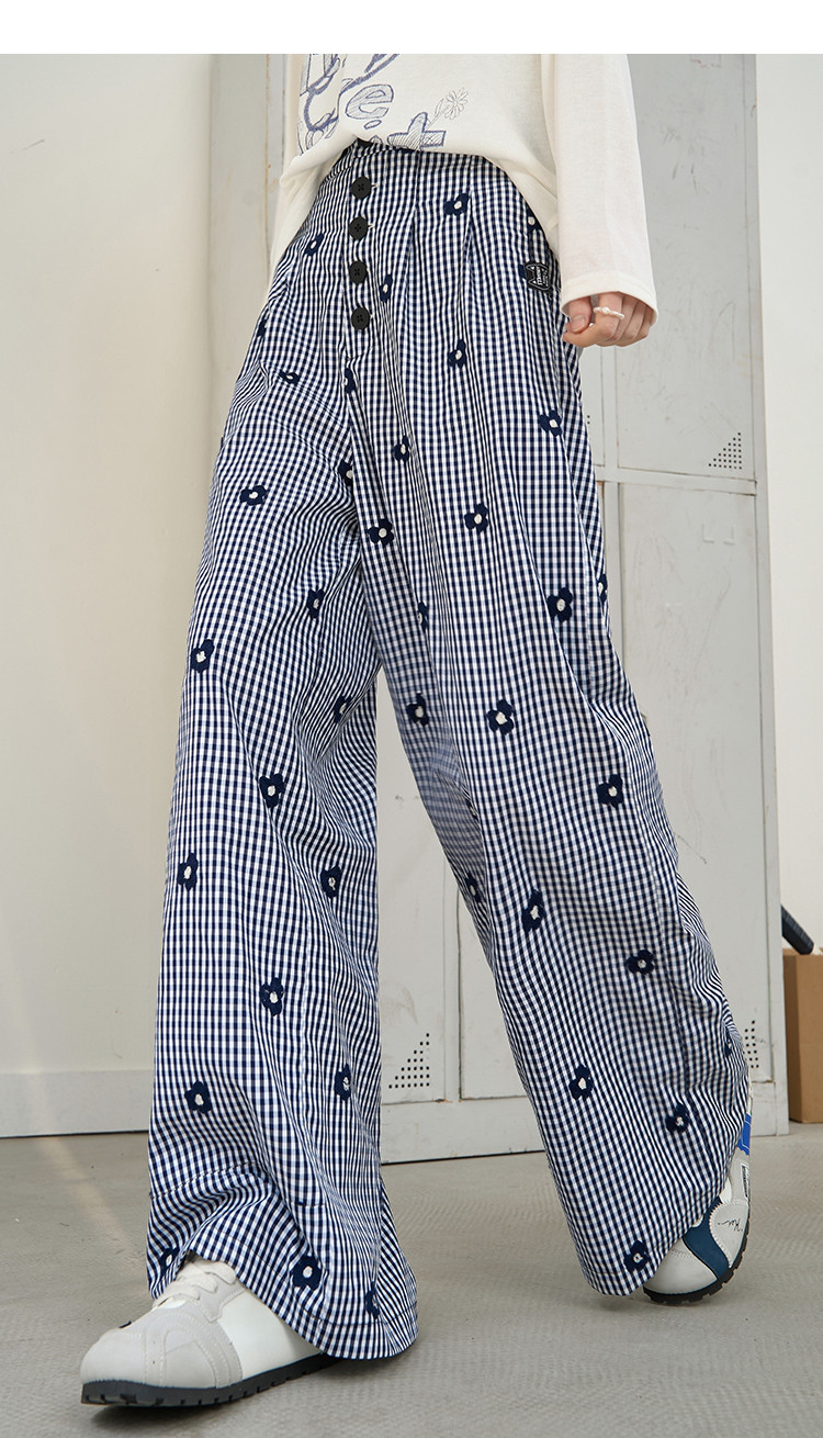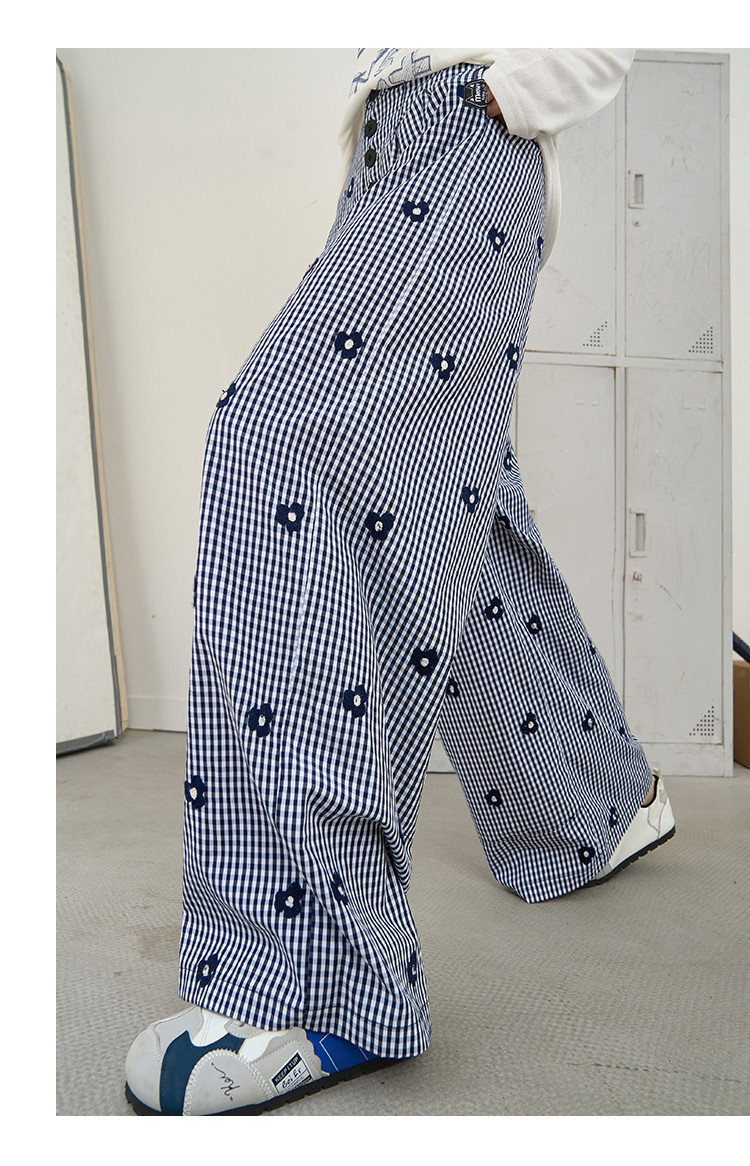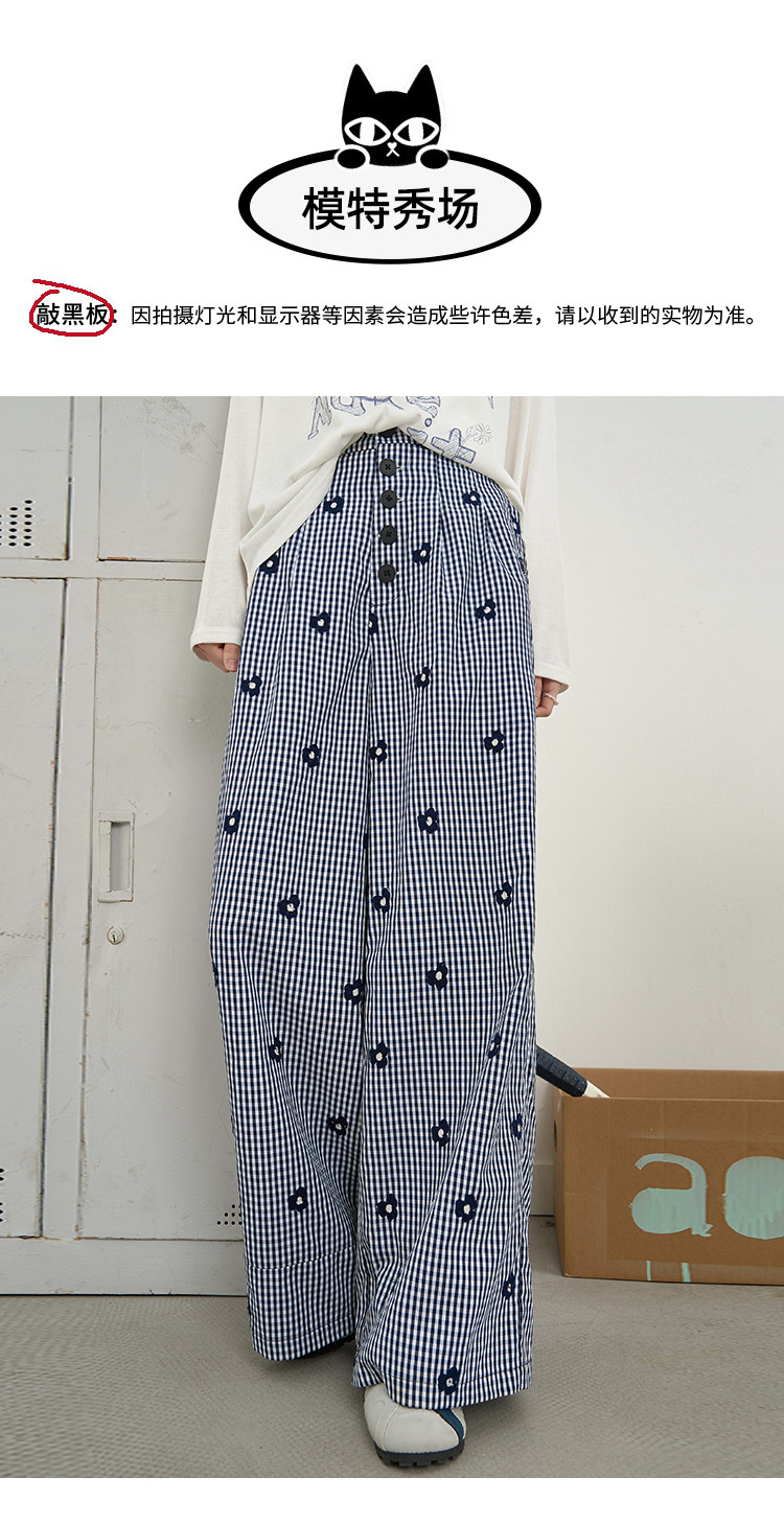 商品名称:格纹刺绣小花文艺休闲阔腿裤2025夏季宽松百搭女式休闲裤 639197