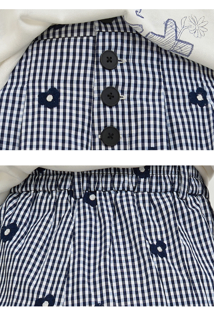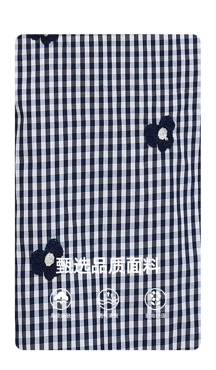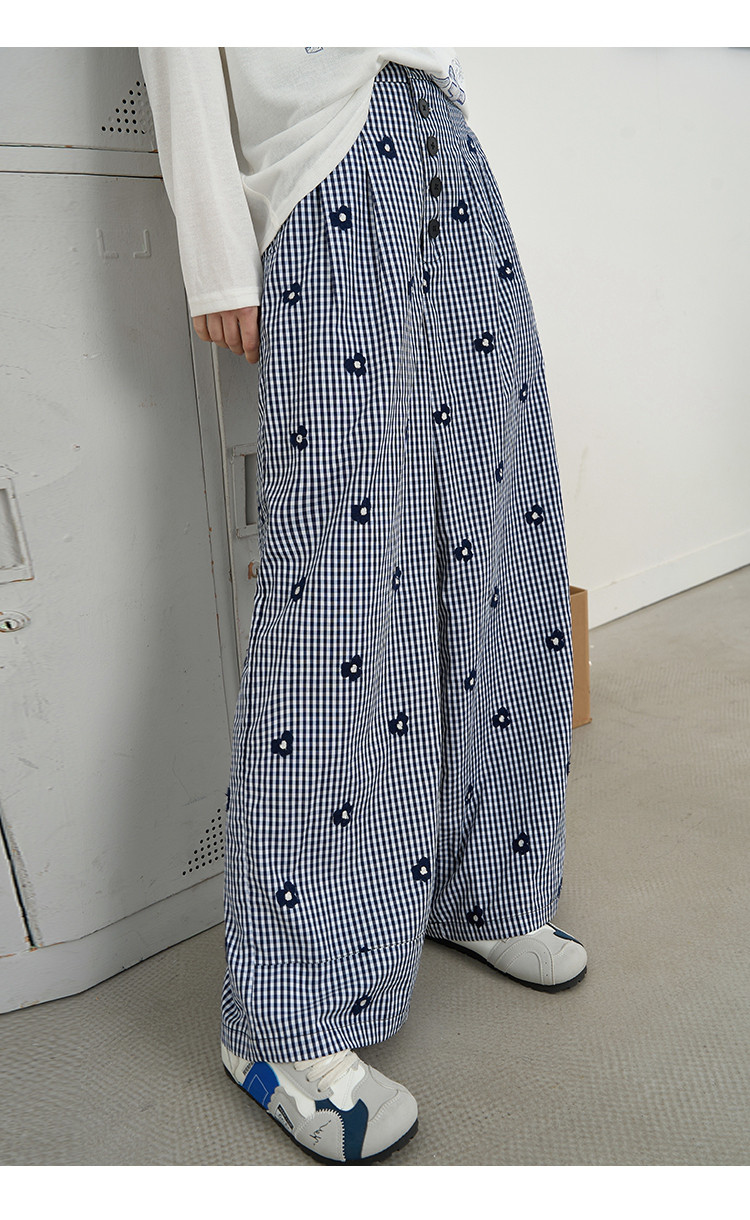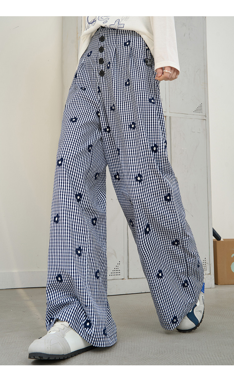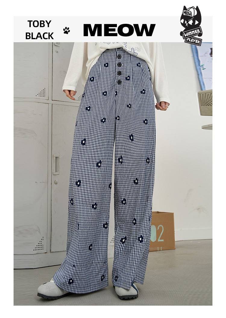 商品名称:格纹刺绣小花文艺休闲阔腿裤2025夏季宽松百搭女式休闲裤 639197