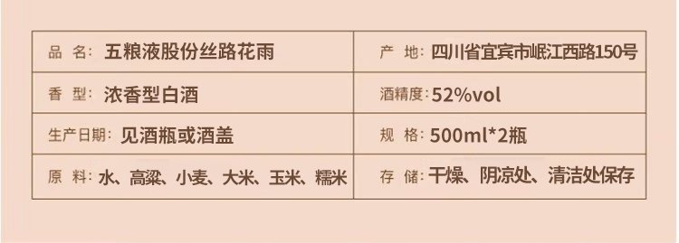 商品名称:五粮液 丝路花雨 52度浓香型白酒 500ml*2瓶礼盒装
