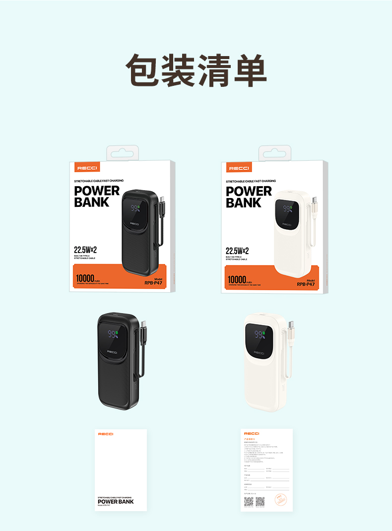 商品名称:Recci/锐思10000mAh缩线快充移动电源RPB-P47